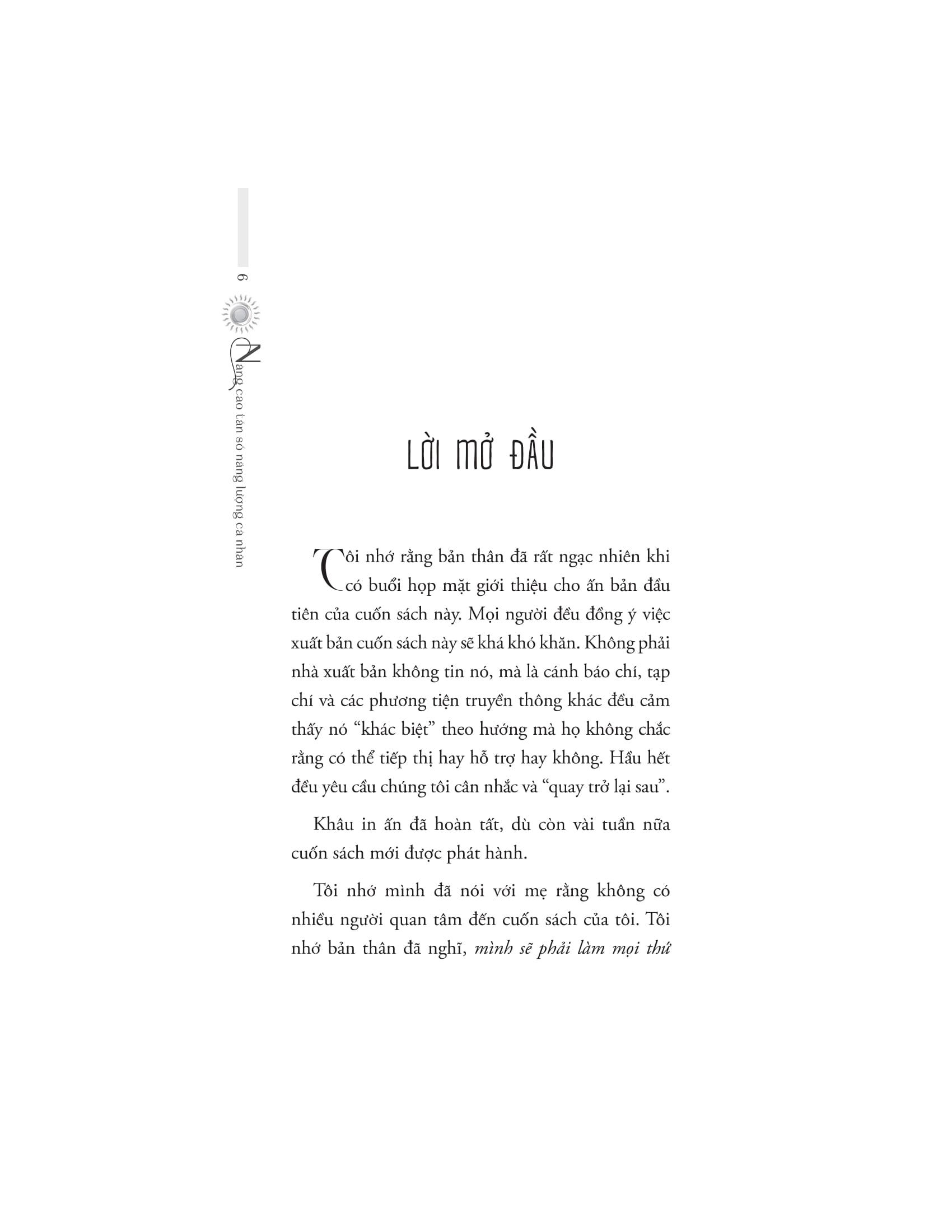 Nâng cao tần số năng lượng cá nhân là một cuốn sách không thể thiếu trên hành trình nâng cao tần số năng lượng này. Bằng các phương pháp như thiền, sử dụng chú ngữ, sống với mục đích và thái độ đúng đắn,... chúng ta sẽ nâng cao được tần số của bản thân. Cuốn sách mang tới 77 bài tập thực hành chi tiết, vô cùng dễ hiểu, dễ thực hành để bất kỳ ai cũng có thể đạt được mục tiêu này.