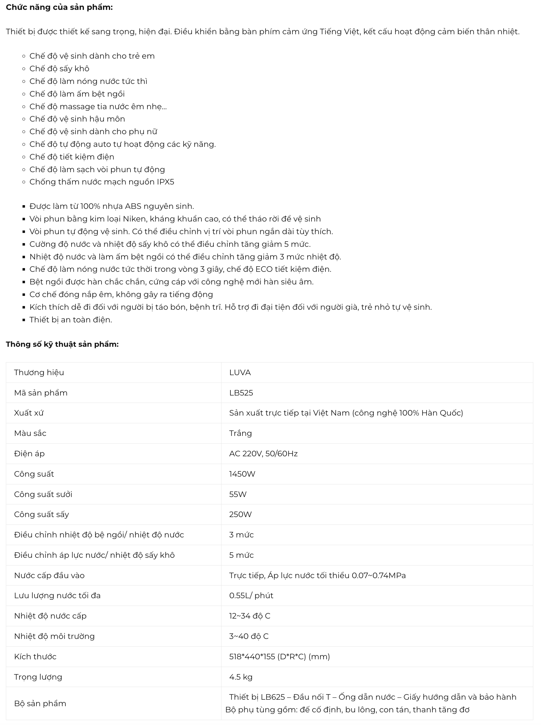 Nắp Bồn Cầu Điện Tử LUVA Bidet LB625, Bảng Điều Khiển Cảm Ứng Tiếng Việt, Bảo Hành 3 Năm, Đổi Lỗi 100 Ngày, Sấy Khô LUVA cam kết KHÔNG sử dụng bất kỳ linh
