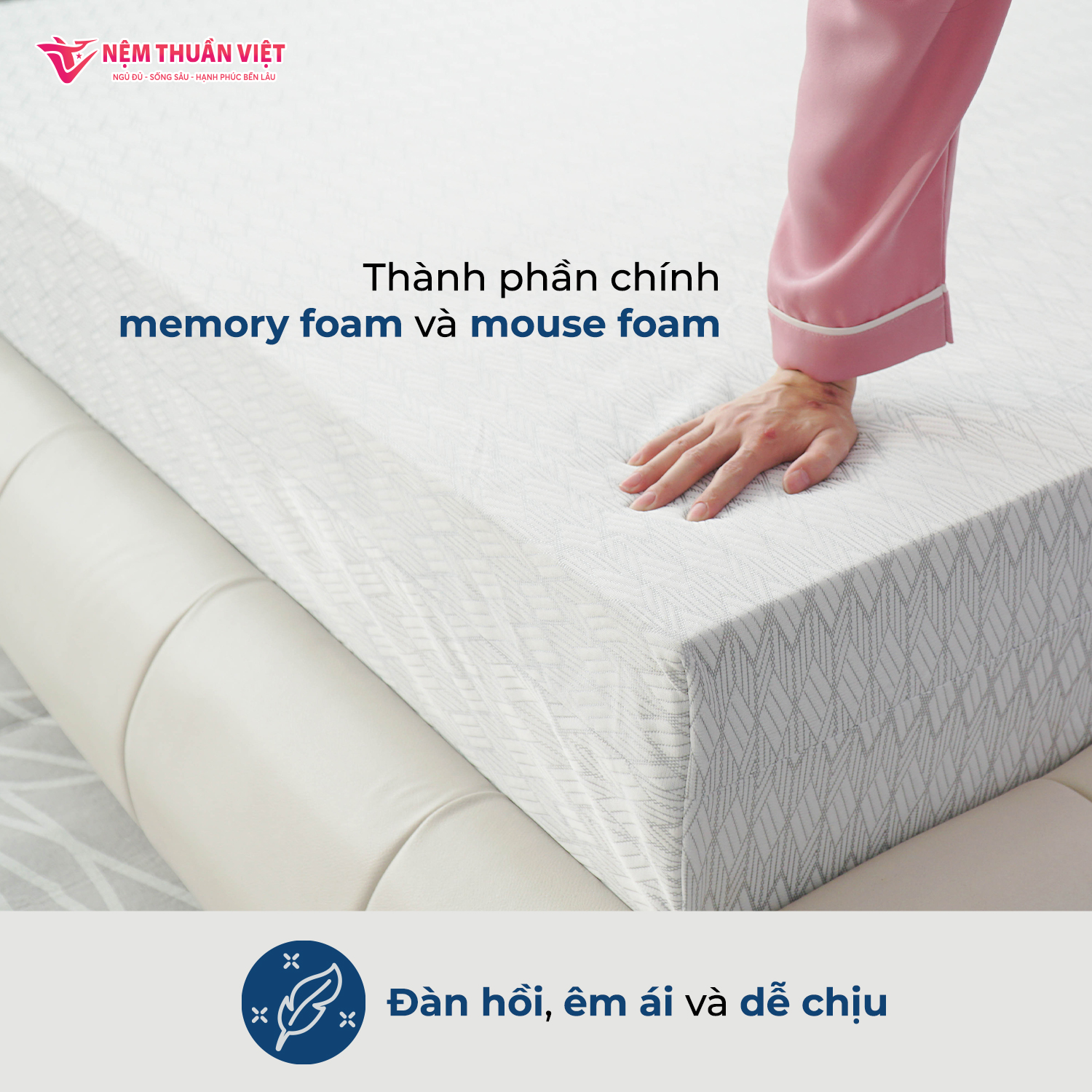 VỀ CẤU TẠO: Nệm Foam Thuần Việt Premium có thành phần chính là Memory Foam cao cấp và Mousse Foam với độ êm ái tối ưu, độ đàn hồi cao, hỗ trợ trạng thái ngủ thoải mái nhất và định hình cột sống thẳng đẹp. VỀ THIẾT KẾ: Nệm được thiết kế 1 mặt lỗ tròn và 1 mặt lỗ vuông lớn, có độ thoáng khí cao. Lớp áo nệm được làm từ chất liệu vải gấm mềm mại, thấm hút tốt Gam màu trắng sáng thêu họa tiết hoa văn nổi tinh tế giúp căn phòng thêm phần thanh lịch, hiện đại CÔNG NĂNG VƯỢT TRỘI Không chỉ bởi chất lượng tương đương các thương hiệu nệm hàng đầu khác, Nệm Foam Thuần Việt Premium còn được ưa chuộng nhờ có mức giá phải chăng, mẫu mã sang trọng, đa dạng kích thước và tích hợp nhiều công năng tuyệt vời