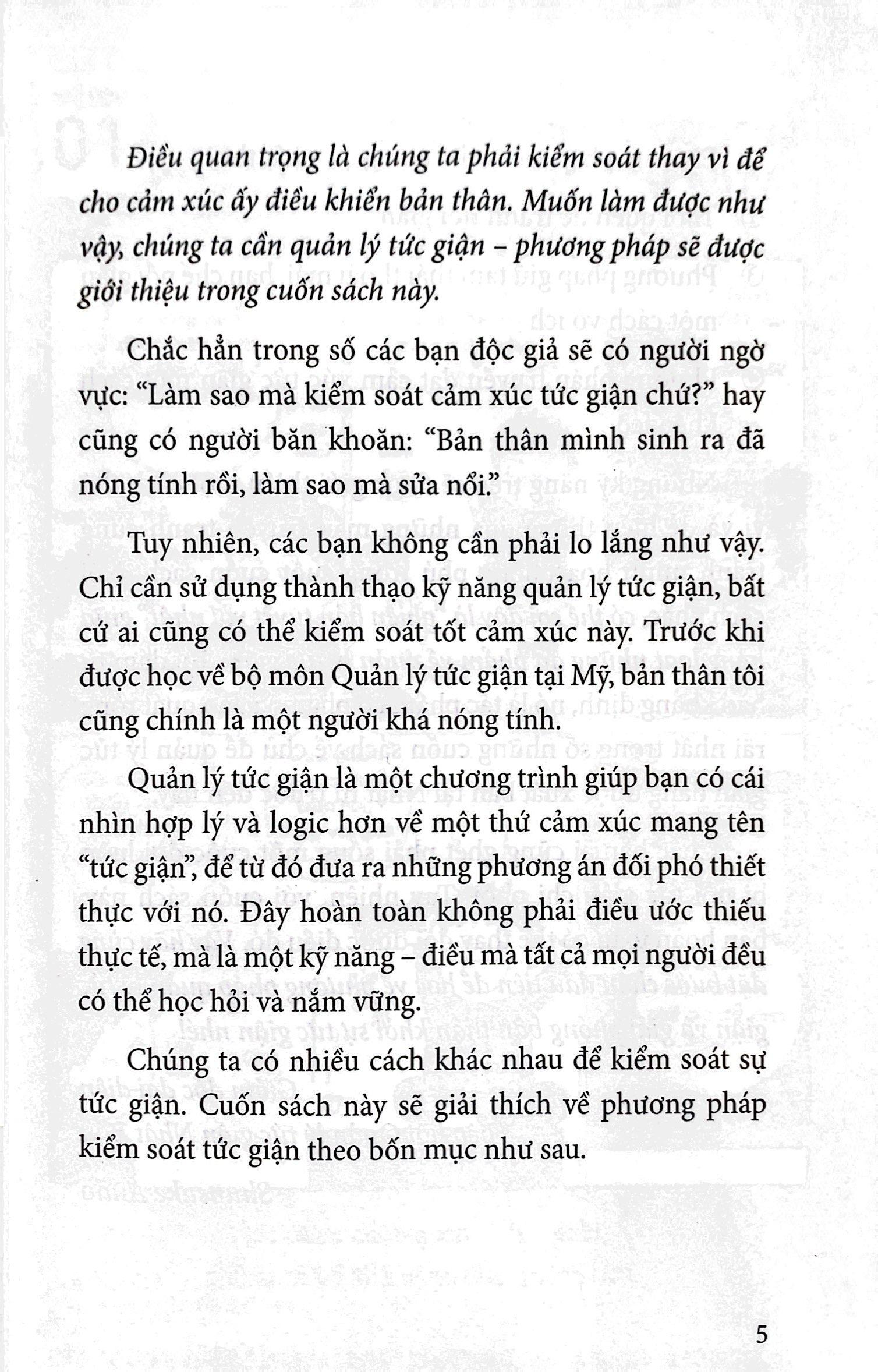 Ném Cơn Giận Vào Tủ Lạnh Có thể nói tức giận là cảm xúc duy nhất có khả năng phá hỏng cuộc sống của chúng ta trong chớp mắt. Vài lời buột miệng lúc nóng nảy đủ để hủy hoại mối quan hệ, lòng tin tưởng và sự tín nhiệm người khác dành cho ta, thậm chí là cả con đường công danh sự nghiệp mà ta đã cất công gây dựng từ trước đến nay. Tuy nhiên, bản thân cảm xúc tức giận không nhất thiết là một điều tiêu cực, tồi tệ. Tức giận là cảm xúc mà con người sinh ra đã có, đồng thời là một cảm xúc cực kỳ thiết yếu trong quá trình sinh tồn của nhân loại. Điều quan trọng là chúng ta phải kiểm soát thay vì để cho cảm xúc ấy điều khiển bản thân. Muốn làm được như vậy, chúng ta cần quản lý tức giận (anger management) – phương pháp sẽ được giới thiệu trong cuốn sách này. Chắc hẳn trong số các bạn độc giả sẽ có người ngờ vực “Làm sao mà kiểm soát nổi một thứ như cảm xúc tức giận chứ?”. Có lẽ cũng có người băn khoăn “Bản thân m.ình sinh ra đã nóng tính rồi, làm sao mà sửa nổi.” Tuy nhiên, các bạn không cần cảm thấy lo lắng. Chỉ cần sử dụng thành thạo kỹ năng quản lý tức giận, bất cứ ai cũng có thể kiểm soát tốt cảm xúc này. Quản lý tức giận là một chương trình giúp bạn có cái nhìn hợp lý và logic hơn về cảm xúc “tức giận”, để từ đó đưa ra những phương án đối phó thiết thực. Đây hoàn toàn không phải ước vọng vẩn vơ thiếu thực tế, mà là một kỹ năng mà tất cả mọi người đều có thể học hỏi và nắm vững. Chúng ta có nhiều cách khác nhau để kiểm soát sự tức giận. Cuốn sách này sẽ giải thích về phương pháp kiểm soát tức giận theo 4 mục như sau: