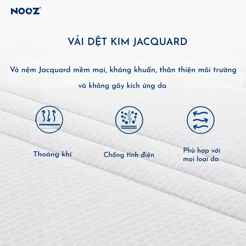 Ngủ ngon và sâu hơn với sự nâng đỡ và công nghệ ngăn cách chuyển động từ Nệm Foam Hybrid Nooz Home Goods Việc dành 8 tiếng mỗi ngày để ngủ trên một chiếc nệm quá cứng hoặc quá mỏng sẽ làm bạn cảm thấy mệt mỏi vào ngày hôm sau. Với chất liệu High Density Foam và Convoluted Foam êm ái, nệm Foam Hybrid Nooz Home Goods có khả năng nâng đỡ đầu và toàn bộ cơ thể theo đường cong tự nhiên của cột sống. Kết hợp cùng lò xo túi độc lập (Pocket Coil) giúp ngăn cách chuyển động, giảm tiếng ồn, giúp bạn tận hưởng giấc ngủ một cách trọn vẹn nhất mà không bị ảnh hưởng bởi người bên cạnh. Chi tiết sản phẩm: Bộ sản phẩm bao gồm: Lò xo túi độc lập, Convulated Foam, High Density Foam và vỏ bọc ngoài vải dệt kim Jacquard Quy cách đóng gói: Đóng thùng carton và bọc PE