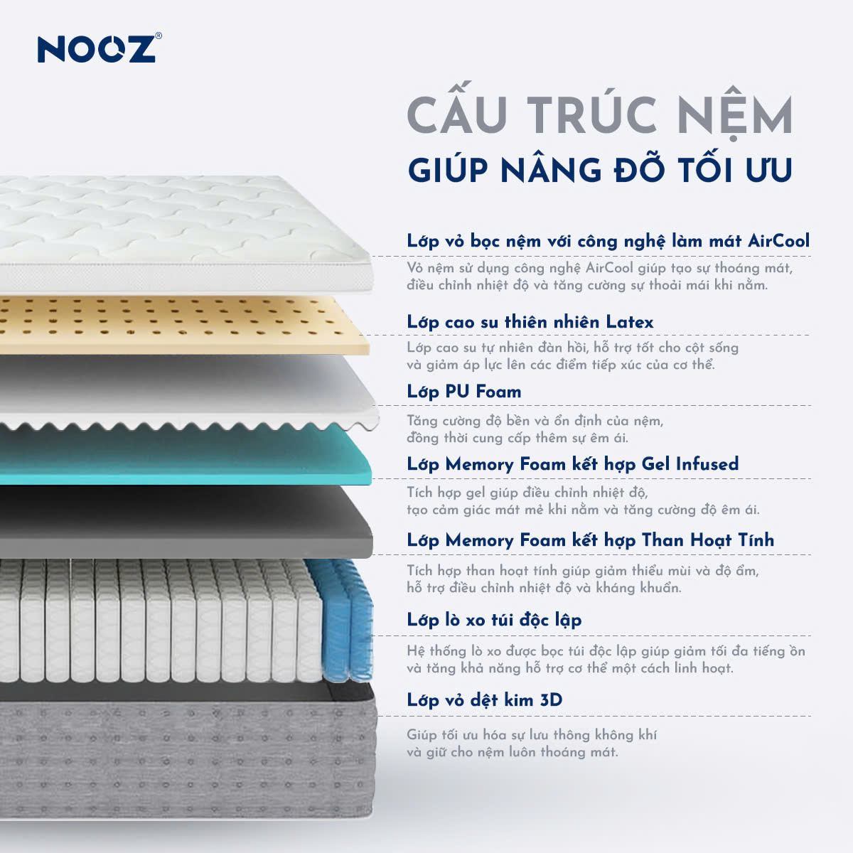 ✨Nệm Foam Hybrid Latex NOOZ Home Goods Mattress Đệm Với Tầng Lò Xo Túi Và Lớp Cao Su Non Thiên Nhiên