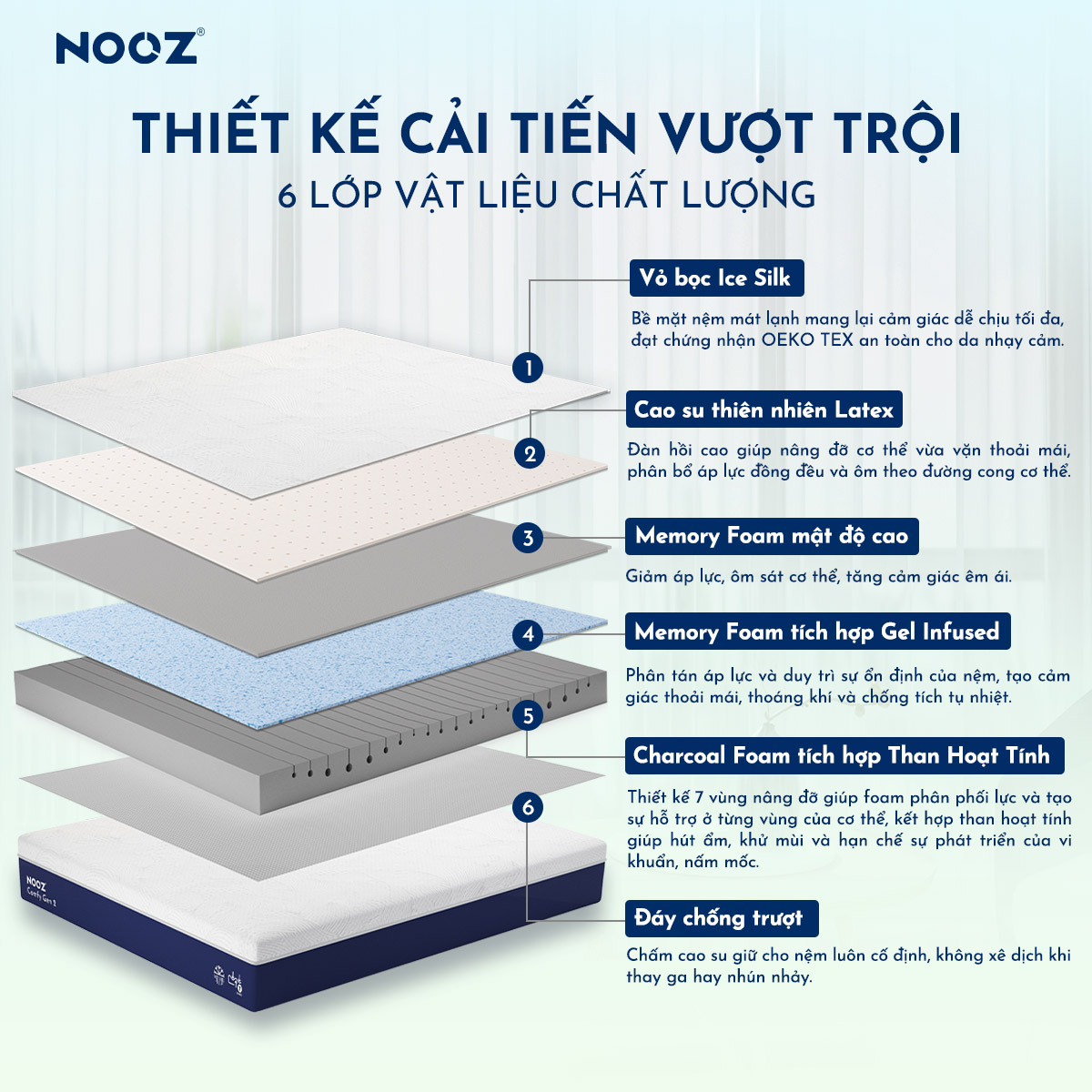 ✨Nệm Foam NOOZ Comfy Gen 2 25cm Đệm Cao Su Thiên Nhiên Và Tầng Foam 7 Vùng Nâng Đỡ NOOZ Home Goods