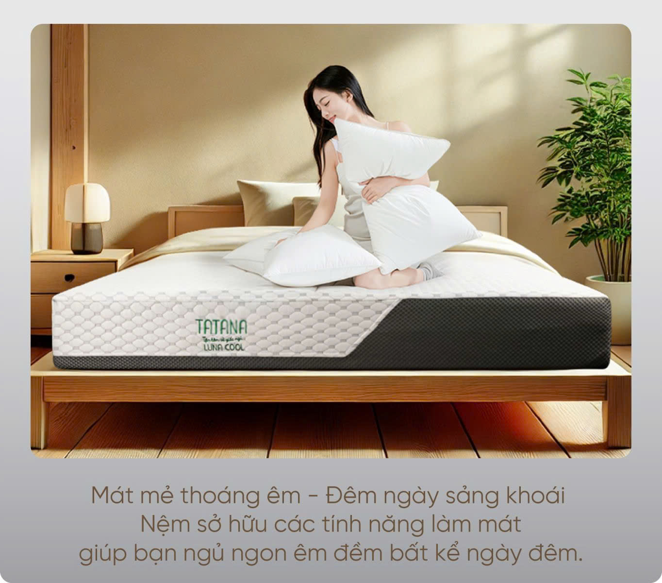 Nệm Luna Cool Tatana là dòng nệm có độ đàn hồi cao, giúp nâng đỡ trọn vẹn các đường cong cơ thể. Nệm Luna Cool được trang bị thêm lớp Gel Memory Foam xanh giúp nệm trở nên mát mẻ vào mùa hè và ấm áp vào mùa đông. Ngoài ra, nệm còn sở hữu nhiều ưu điểm khác nhau mang đến cho người dùng cảm giác thoải mái tối ưu khi nằm.