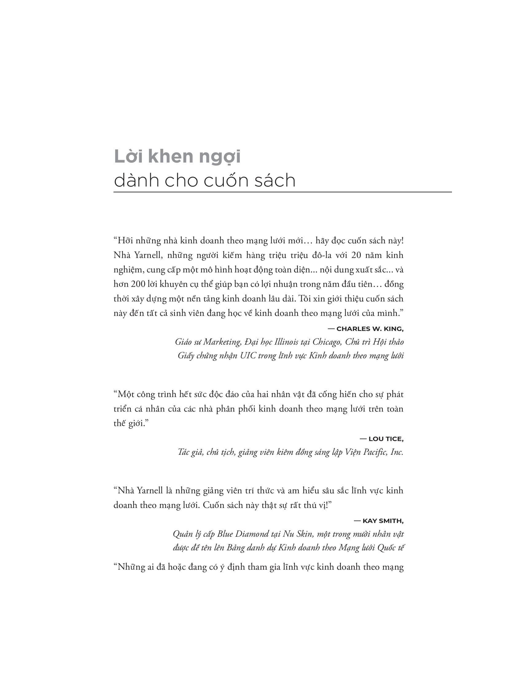 Với cả cuộc đời tham gia, đào tạo và huấn luyện tuyến dưới trong ngành kinh doanh mạng lưới rồi đạt được thành công vang dội trong ngành này tại nước Mỹ, Mark Yarnell và Rene Reid Yarnell sẽ giúp bạn tránh khỏi những cạm bẫy và sai lầm, đồng thời chỉ ra con đường đúng đắn giúp bạn đạt được tự do tài chính và tận hưởng khoảng thời gian tự do để ở bên những thân yêu, hay làm bất kỳ điều gì bạn mơ ước.