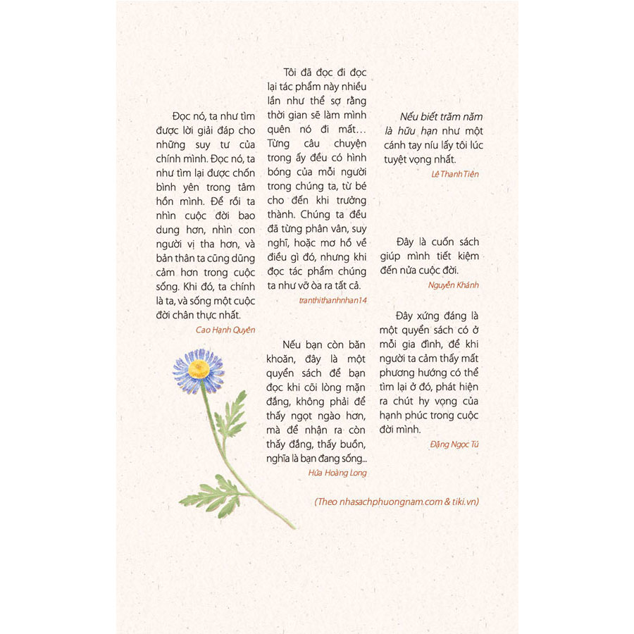 “Đọc nó, ta như tìm được lời giải đáp cho những suy tư của chính mình. Đọc nó, ta như tìm lại được chốn bình yên trong tâm hồn mình. Để rồi ta nhìn cuộc đời bao dung hơn, nhìn con người vị tha hơn, và bản thân ta cũng dũng cảm hơn trong cuộc sống. Khi đó, ta chính là ta, và sống một cuộc đời chân thực nhất.” – Cao Hạnh Quyên