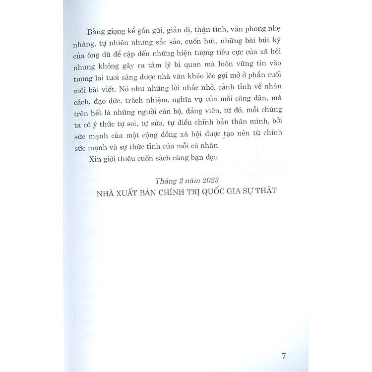 Với 40 bài viết, mỗi bài là một câu chuyện chất chứa những suy tư, chiêm nghiệm của tác giả trước những vấn đề nóng bỏng của xã hội và thời đại, những vấn đề còn cần phải bàn đến trong công tác xây dựng Đảng như: trách nhiệm công dân, gương người tốt, việt tốt, nhận thức về lý tưởng của người vào Đảng, trách nhiệm của người đảng viên, sự nêu gương của cán bộ lãnh đạo, trọng dụng người tài đức, các biểu hiện suy thoái tư tưởng chính trị, đạo đức, lối sống của không ít cán bộ, đảng viên…