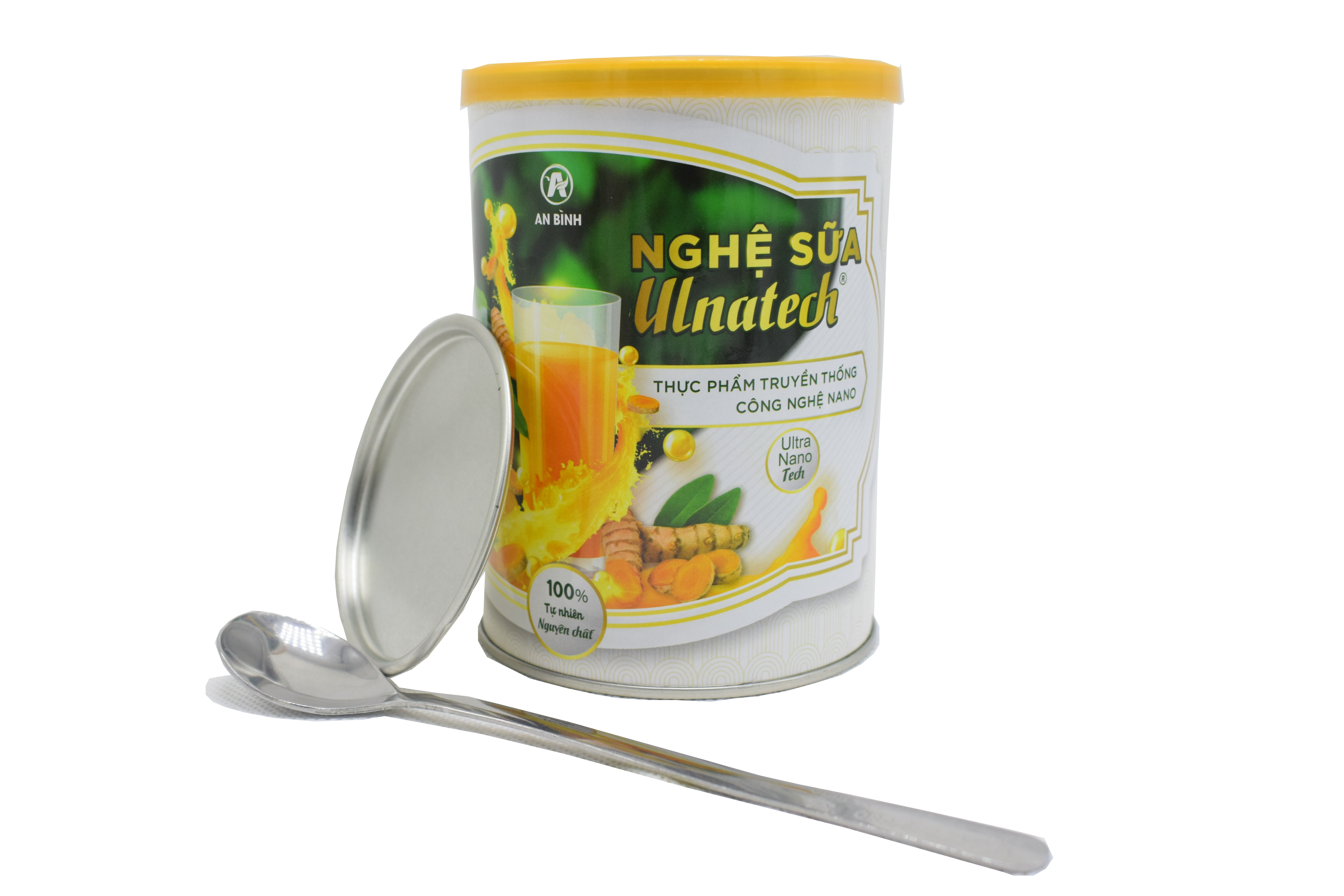 NGHỆ SỮA ULNATECH. Tên sản phẩm: Nghệ sữa Nano Ulnatech. Dạng bột. Màu sắc: Vàng cam. Thành phần: Tinh nghệ nano curcumin, Sữa nhập khẩu tách béo Newzealand. Hàm lượng Nano Curcumin: 23.000mg/kg Công nghệ sử dụng: Công nghệ nano vật lý, không dung môi hóa học, không chất bảo quản. Sản xuất: Công ty Dược Hoàng Kỳ. CÔNG DỤNG SẢN PHẨM