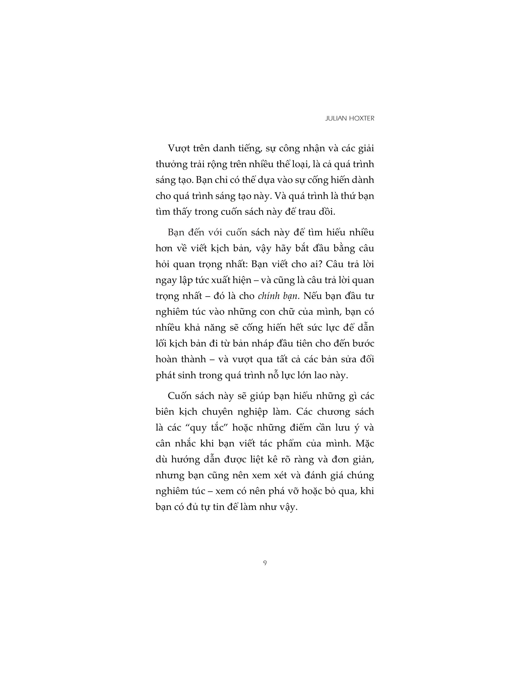 Cuốn sách còn đưa bạn khám phá ngành công nghiệp điện ảnh Hollywood: cách thức nó phát triển, hậu trường của những bộ phim mang tính biểu tượng cùng với những bộ phim thử nghiệm của các biên kịch sáng tạo đã vượt qua các quy tắc và mở con đường cho riêng mình lên màn ảnh vàng. Khi bước sang phần thú vị hơn—viết—chúng ta có các quy tắc đã được thử và cho thấy hiệu quả. Mỗi chương đều có kèm theo một bài tập sáng tạo để giúp bạn hiểu sâu hơn về điều gì khiến một kịch bản trở nên sống động.