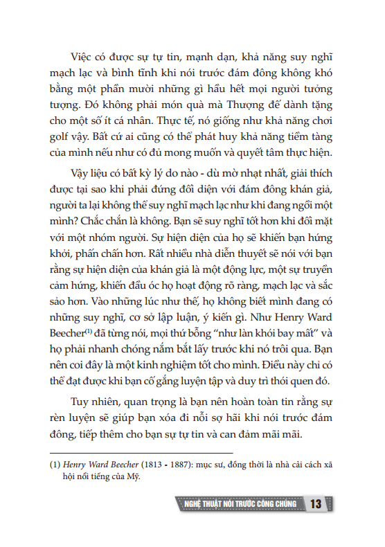 Giao tiếp là nghệ thuật có ảnh hưởng lớn đến hàng triệu cá nhân trong xã hội từ những diễn giả, chính trị gia, nhà quản lý đến học sinh, sinh viên hay nhân viên bán hàng… Nghệ thuật nói trước công chúng là một tác phẩm xuất sắc về giao tiếp, chinh phục công chúng của Dale Carnegie – tác giả cuốn Đắc nhân tâm nổi tiếng. Những phương pháp giao tiếp, diễn thuyết có giá trị thực tiễn trong tác phẩm sẽ mang lại cho bạn mối quan hệ bạn bè, khách hàng tốt hơn trong công việc và cuộc sống.