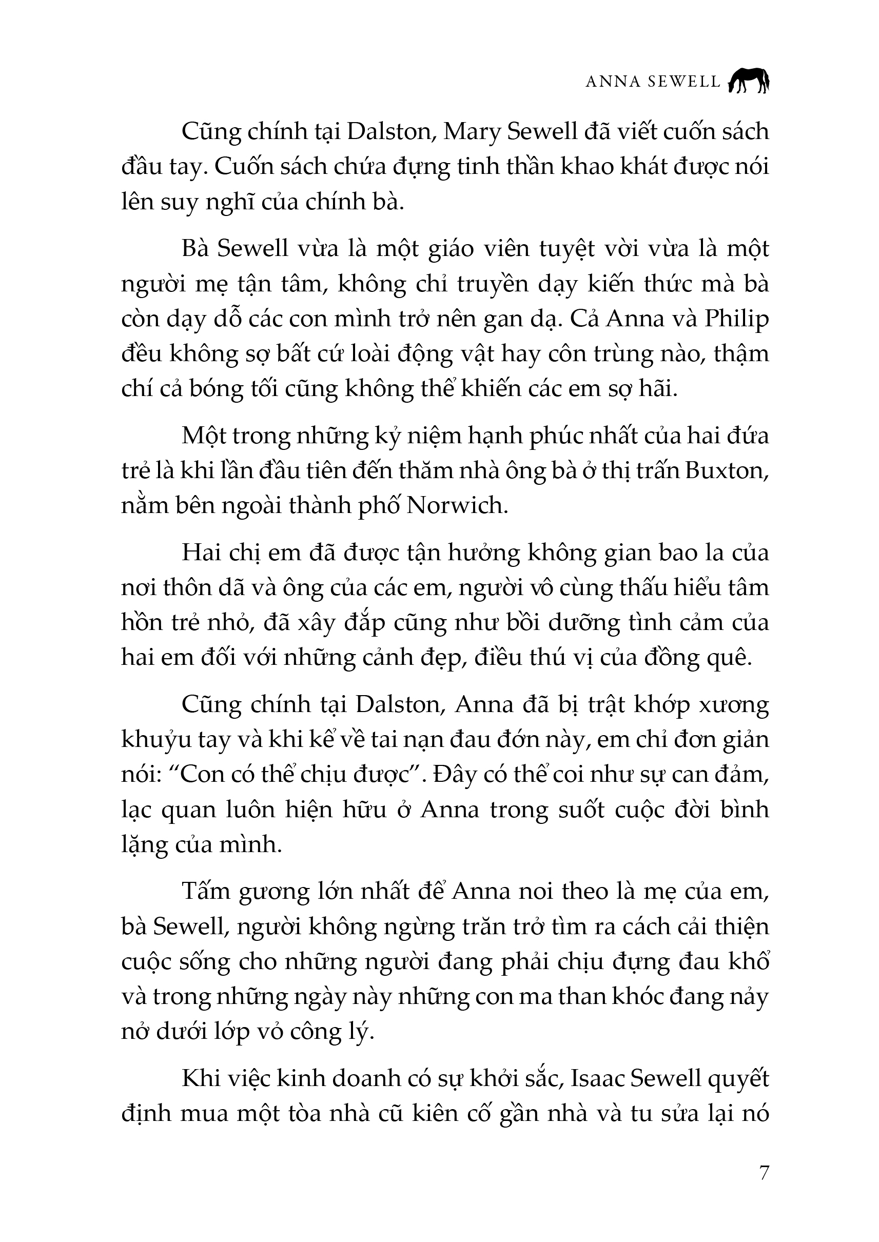 đời. Nhờ công việc của cha tại trạm nuôi ngựa Shoreham mà tình yêu của Anna dành cho loài ngựa dần dần được hình thành và nảy nở. Anna Sewell không hề có ý định trở thành nhà văn.