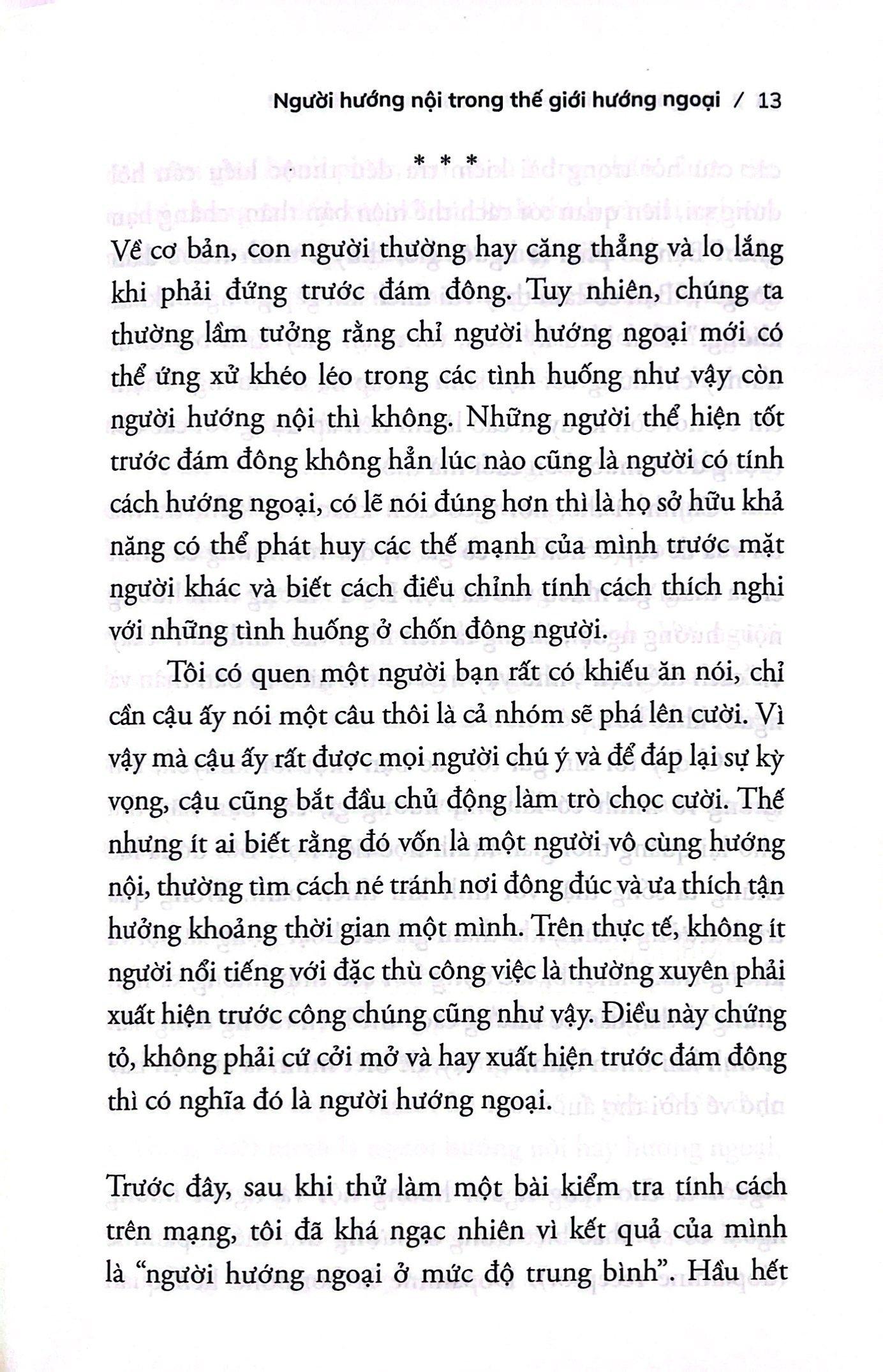 Ép buộc mọi người phải trở nên hướng ngoại là một hình thức bạo lực xã hội. Những người hướng nội cũng hoàn toàn có thể dùng phương pháp của mình - theo cách thức thật dịu dàng, thật tinh tế - để lay động lòng người và rung chuyển toàn thế giới.