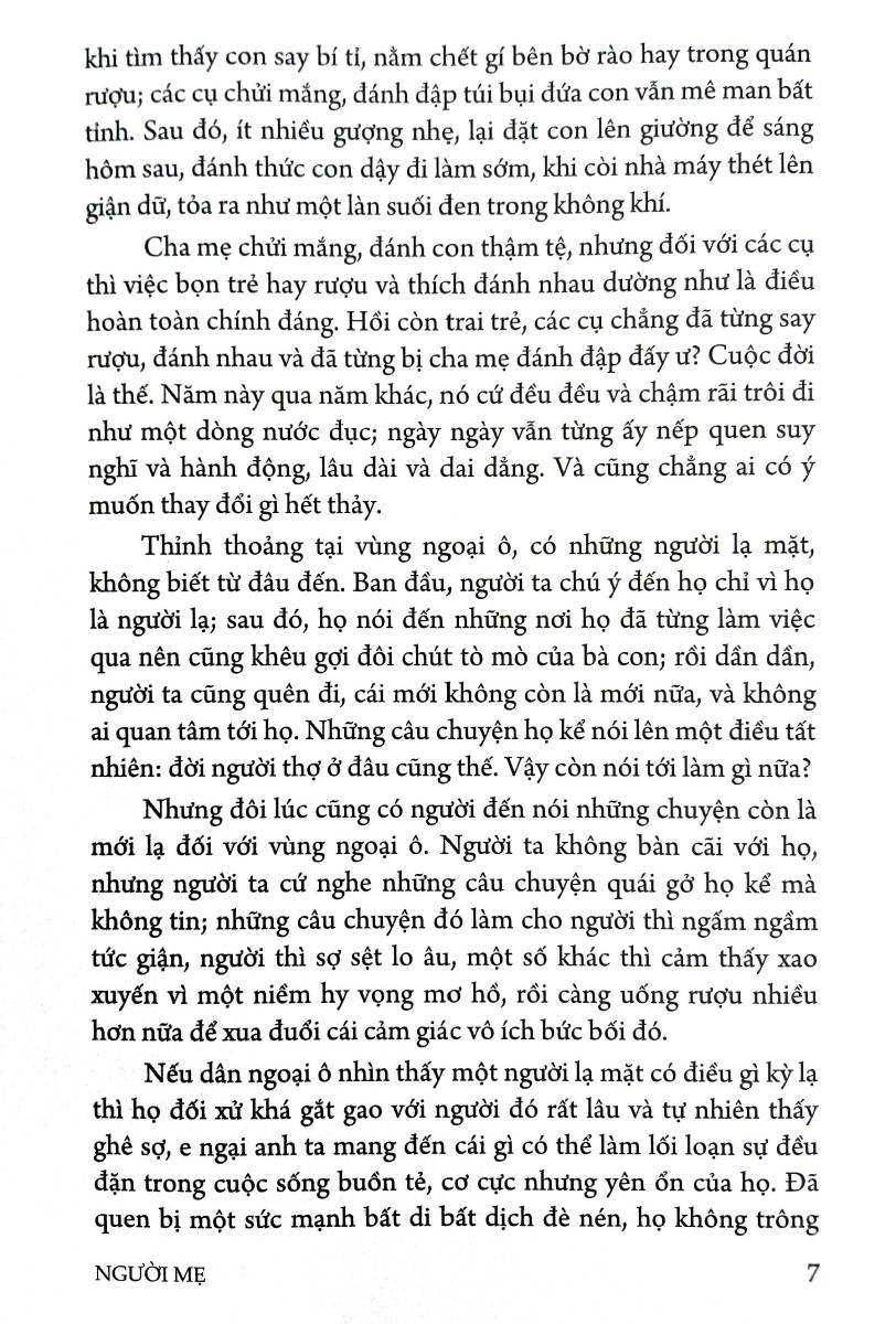 Người Mẹ là một trong những tiểu thuyết tiêu biểu nḣất của Macxim Gorky. Tiểu thuyết ra đời vào năm 1907, tái hiện bối cảnh xã hội nước Nga vào thế kỷ 20, mô tả đời sống của bộ phận công nhân ở nhà máy, phong trào công nhân dưới sự lãnh đạo của Đảng, cuộc đấu tranh chống chủ nghĩa tư sản. Tiểu thuyết kể về người mẹ, đại diện cho người phụ nữ hiền lành, hết lòng yêu thương con nhưng phải chịu nhẫn nhục, áp bức cả về thể xác lẫn tinh thần từ người chồng. Bà có cậu con trai là Paven từ một công nhân bình thường nhưng được đánh thức, rèn luyện để dấn thân vào con đường cách mạng và sau đó là cuộc đấu tranh gian khổ và kiên cường của công nhân dưới sự dẫn dắt của Đảng.