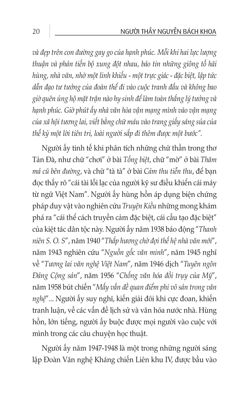Nhà văn – Giáo sư Nguyễn Bách Khoa – Trương Tửu (1913-1999) là một trong những nhà lý luận phê bình tài ba nhất của thế hệ tiền chiến, một trong những người đi tiên phong trong lãnh vực phê bình văn học, ông còn sáng tác một loạt tiểu thuyết. Người thầy Nguyễn Bách Khoa là những trang viết về cuộc đời và sự nghiệp, những nghiên cứu học thuật và sáng tác, những hồi ức, kỷ niệm về ông…
