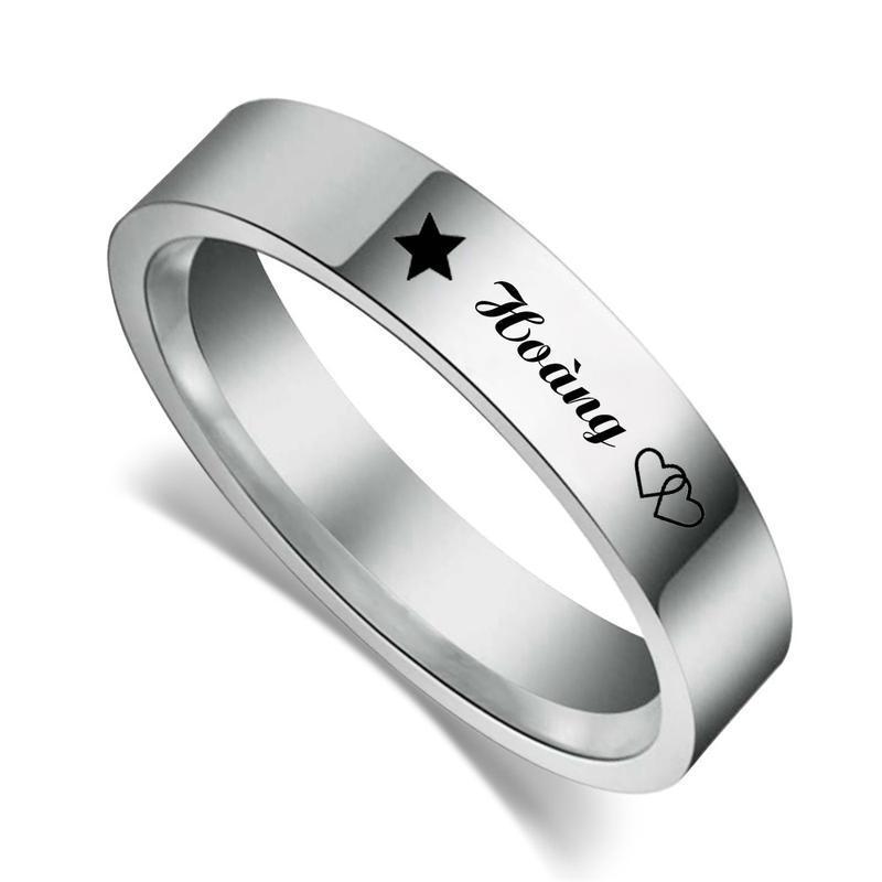 Nhẫn inox theo tên được thiết kế kiểu bản tinh xảo xinh xắn được khắc laser công nghệ hiện đại bật nhất hiện nay với nội dung tên, họa tiết vô cùng đáng yêu. Nhẫn
