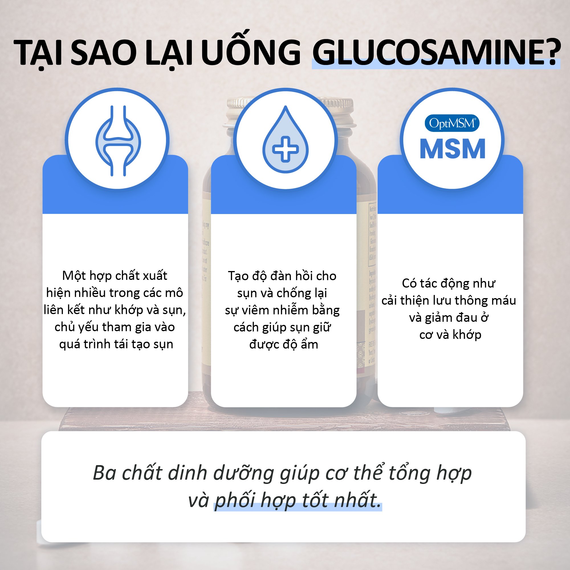 - Bổ sung Glucosamine, Chondroitin và Methyl Sulfonyl Methane (MSM)
