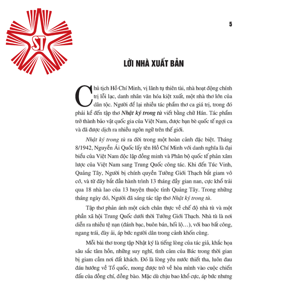 Chủ tịch Hồ Chí Minh, vị lãnh tụ thiên tài, nhà hoạt động chính trị lỗi lạc, danh nhân văn hóa kiệt xuất, một nhà thơ lớn của dân tộc. Người để lại nhiều tác phẩm thơ ca giá trị, trong đó phải kể đến tập thơ Nhật ký trong tù viết bằng chữ Hán. Tác phẩm trở thành b.ảo v.ật qu.ốc của Việt Nam, được bạn bè quốc tế ngợi ca và đã được dịch ra nhiều ngôn ngữ trên thế giới.
