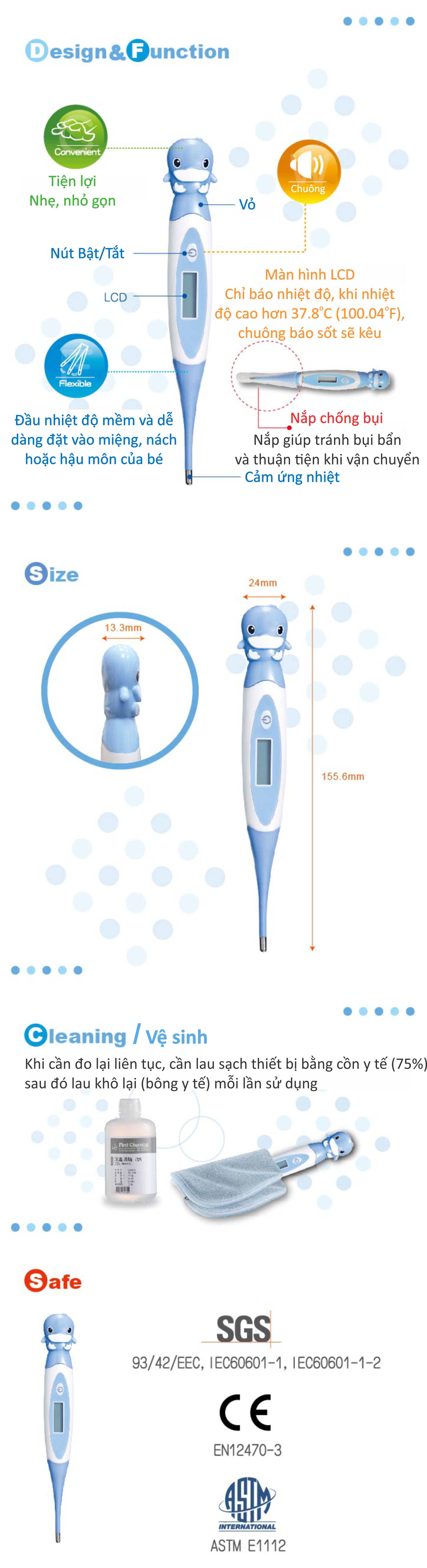 - Thiết kế đầu đo nhiệt mềm mại, linh hoạt, an toàn có thể sử dụng đo ở nách, miệng hoặc hậu môn của bé, giúp kiểm soát tình trạng tăng giảm nhiệt độ, đánh