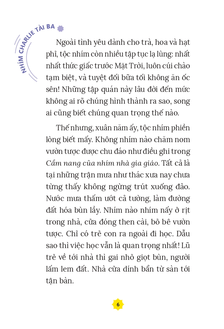 Cuộc sống trên đảo nhím của Charlie đang vui vẻ biết bao. Thì bỗng nhiên, vua tộc nhím nảy ra một ý tưởng rất… tào lao. Vương quốc nhím đối mặt lâm nguy, và Charlie phải ra tay giải cứu! Nhím Charlie tài ba là bộ truyện thiếu nhi hài hước của Callie (Pháp) với tranh minh họa của Anna Griot. Nhím Charlie là một chú nhím gia giáo. Dù đối mặt với những tình huống khó khăn đến đâu, một chú nhím gia giáo sẽ đều có cách vượt qua. Hãy cùng khám phá cẩm nang nhà gia giáo của nhím Charlie nhé!