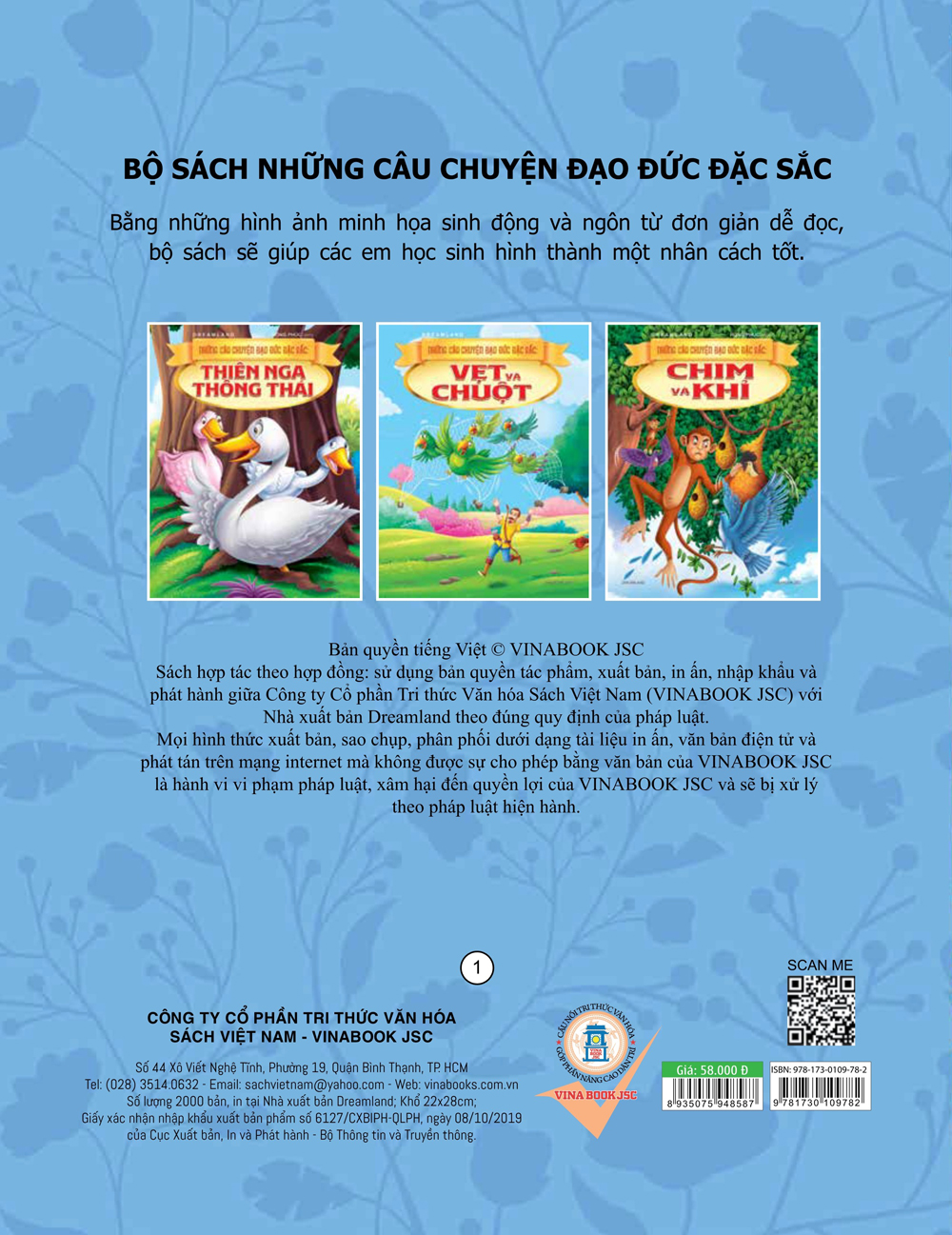 Bộ sách “Những Câu Chuyện Đạo Đức Đặc Sắc” gồm 3 cuốn. Trong mỗi cuốn sách là những câu chuyện với những hình ảnh minh họa sinh động và ngôn từ đơn giản dễ đọc, thông qua đó là những bài học đạo đức giúp các em học sinh hình thành một nhân cách tốt. Thiên nga thông thái, Rệp giường và muỗi, Kẻ mộng mơ, Trí khôn của thỏ là những câu chuyện giáo dục đức tính cẩn trọng, biết nhìn xa trông rộng, sống thật, cũng như sự khôn khéo, thông minh … giúp các em biết cách ứng xử đúng mực trong cuộc sống hằng ngày.