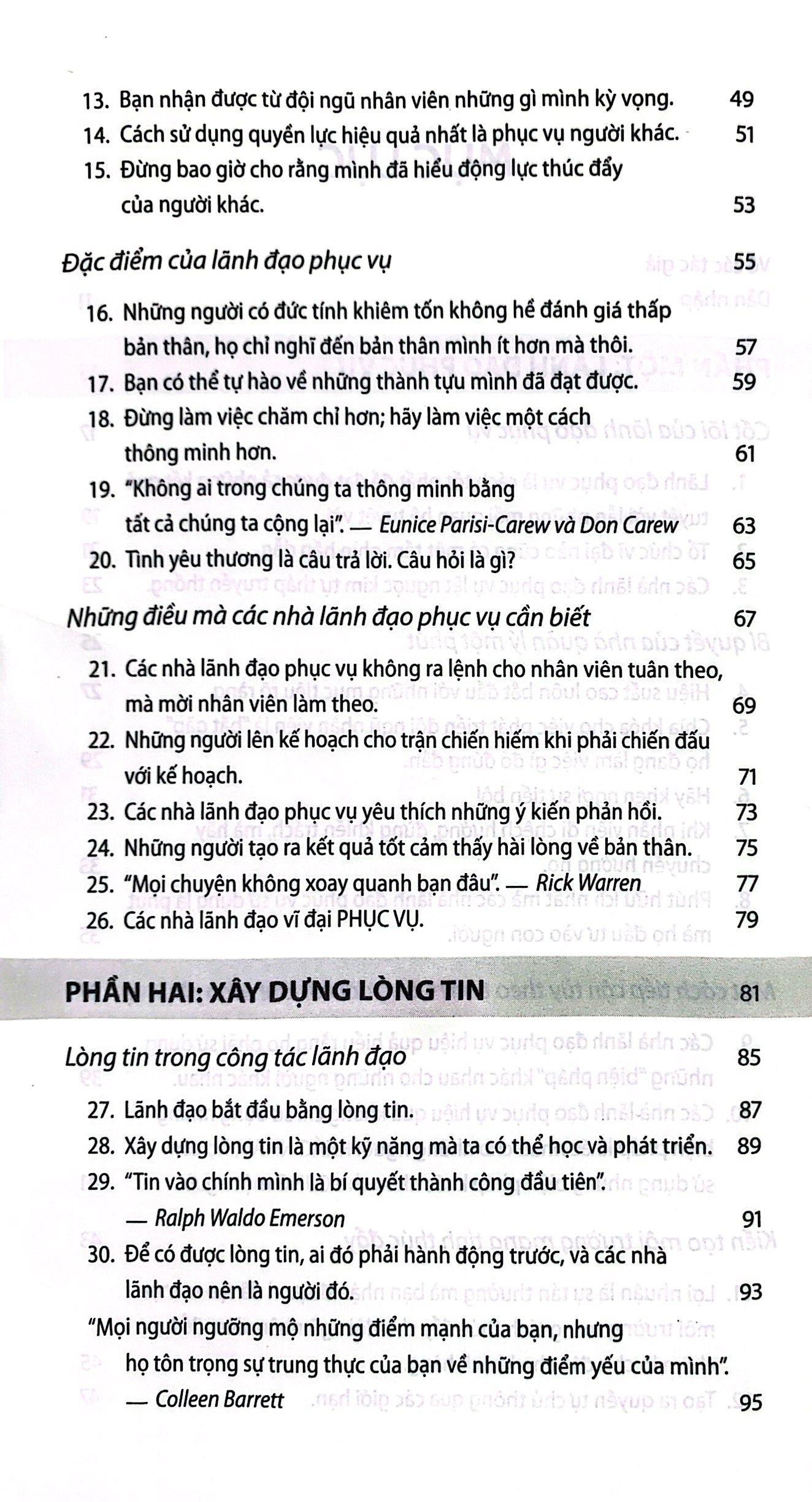 Chứa đựng những hiểu biết sâu sắc, đáng nhớ và đôi khi ngược đời về lãnh đạo, cuốn sách này là một tài liệu tổng hợp gồm hai phần về những niềm tin không thể lay chuyển của Blanchard và Conley về lãnh đạo phục vụ và xây dựng lòng tin – hai lĩnh vực chuyên môn tương ứng của họ. Bạc đọc sẽ được khám phá: