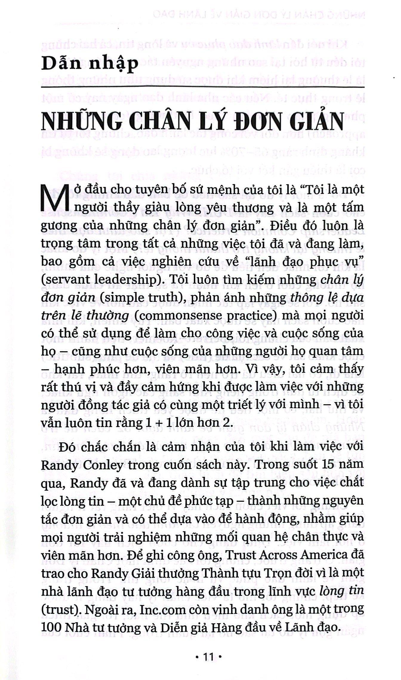 Trong “Những chân lý đơn giản về lãnh đạo”, chuyên gia huyền thoại về lãnh đạo phục vụ là Ken Blanchard, tác giả của những cuốn sách đã bán được hàng triệu bản trên toàn thế giới, và đồng nghiệp Randy Conley, người được cả thế giới biết đến và công nhận vì nhiều năm nghiên cứu về lãnh đạo tư tưởng cũng như sự tinh thông về lĩnh vực “lòng tin”, cùng chia sẻ 52 chân lý đơn giản về lãnh đạo. Những chân lý này sẽ giúp các nhà lãnh đạo ở khắp mọi nơi biến “lãnh đạo theo lẽ thường” thành những thông lệ.