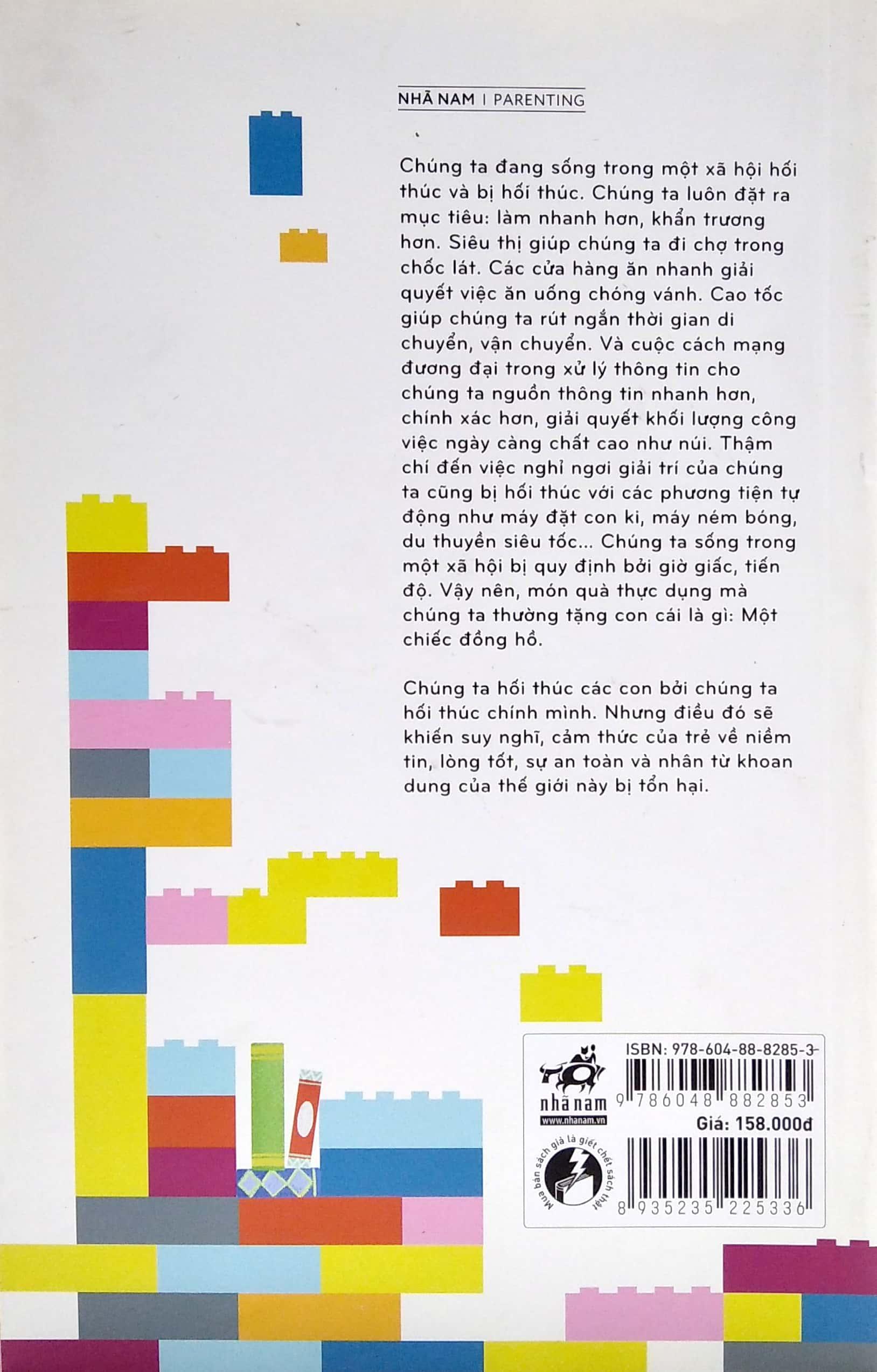 Chúng ta đang sống trong một xã hội hối thúc và bị hối thúc. Chúng ta luôn đặt ra mục tiêu: làm nhanh hơn, khẩn trương hơn. Siêu thị giúp chúng ta đi chợ trong chốc lát. Các cửa hàng ăn nhanh giải quyết việc ăn uống chóng vánh. Cao tốc giúp chúng ta rút ngắn thời gian di chuyển, vận chuyển. Và cuộc cách mạng đương đại trong xử lý thông tin cho chúng ta nguồn thông tin nhanh hơn, chính xác hơn, giải quyết khối lượng công việc ngày càng chất cao như núi. Thậm chí đến việc nghỉ ngơi giải trí của chúng ta cũng bị hối thúc với các phương tiện tự động như máy đặt con ki, máy ném bóng, du thuyền siêu tốc… Chúng ta sống trong một xã hội bị quy định bởi giờ giấc, tiến độ. Vậy nên, món quà thực dụng mà chúng ta thường tặng con cái là gì: Một chiếc đồng hồ.
