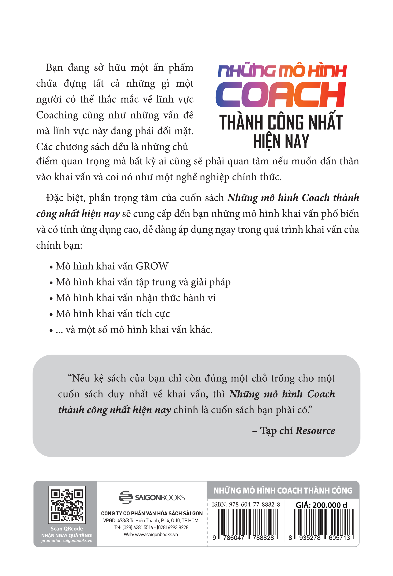 Những mô hình Coach thành công nhất hiện nay là cuốn sách hiếm hoi trên thị trường tập trung vào phân tích cụ thể các mô hình Coach đang được ứng dụng rộng rãi, đồng thời chia sẻ tỉ mỉ về cách ứng dụng trong từng bối cảnh cụ thể để bạn đọc có thể dễ dàng hình dung và áp dụng ngay vào công việc hằng ngày. Bên cạnh đó, cuốn sách còn cung cấp góc nhìn đa dạng về các chủ đề khai vấn phổ biến hiện tại, qua đó khích lệ bạn đọc xem xét thật kỹ để chọn ra phương pháp Coach phù hợp với nhu cầu của bản thân mình.