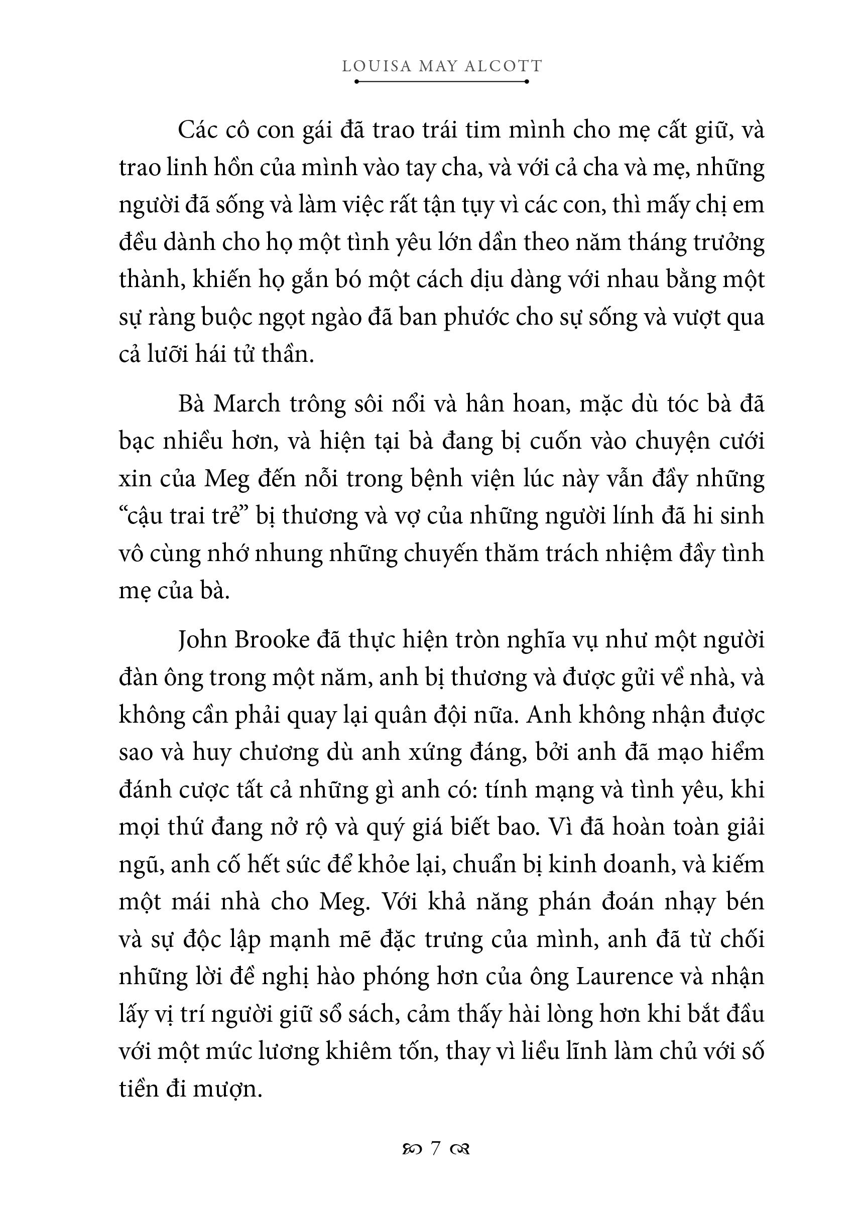 Tiếp đến là Beth hiền lành, người mang trên mình gánh nặng nặng nhất trong bốn chị em. Sức khỏe của Beth ngày một tồi tệ, và Jo đã phải trở về để ngày đêm kề bên chăm sóc em gái của mình. Thế nhưng số phận đã không mỉm cười với Beth, cô đã ra đi trong sự tiếc thương vô ngần của những người thương yêu cô.
