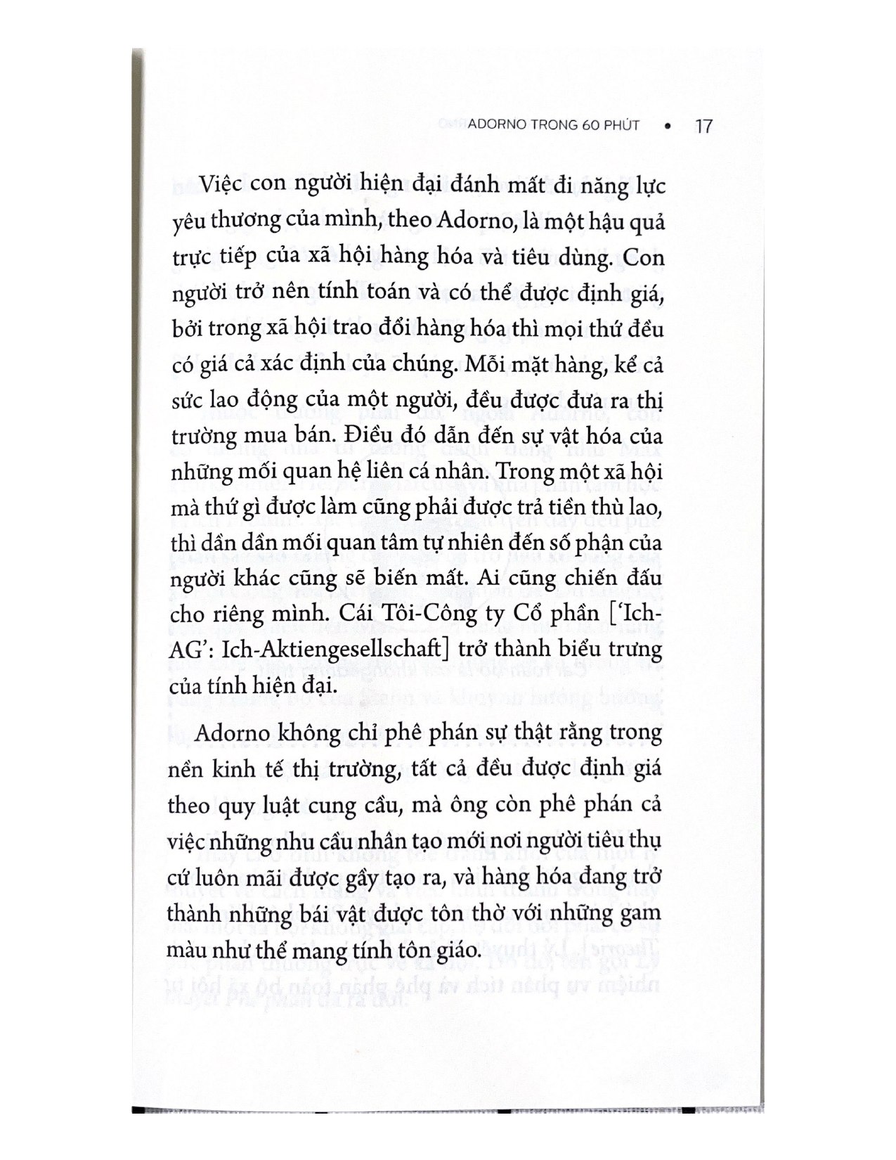 Adorno cho đến ngày hôm nay là một trong những nhà tư tưởng thông thái và thiên bẩm nhất trong lịch sử triết học. “Lý thuyết Phê phán” về xã hội của ông vừa cấp tiến vừa kích động. Theo Adorno, tất cả chúng ta đang sống trong một thế giới hoàn toàn bị chủ nghĩa tư bản thao túng. Thời đại Khai minh với hy vọng lớn về tiến bộ và giải phóng đã bị lộn ngược.
