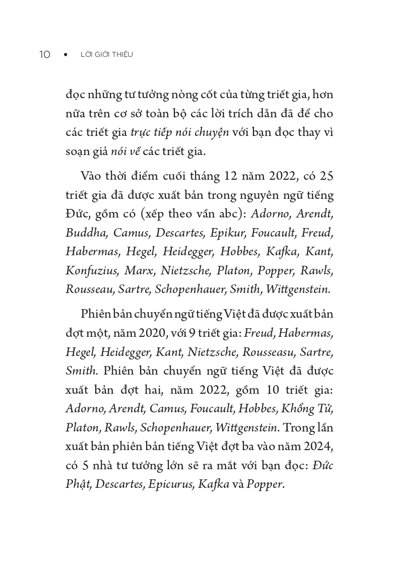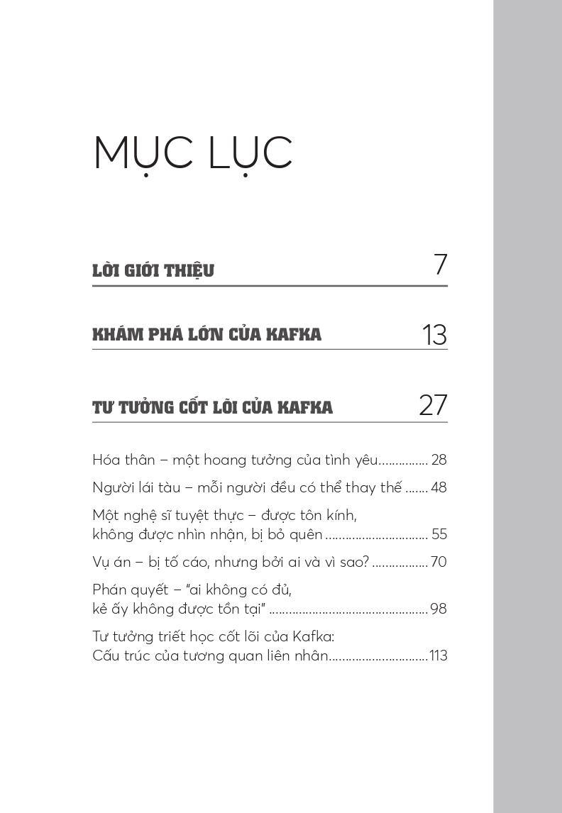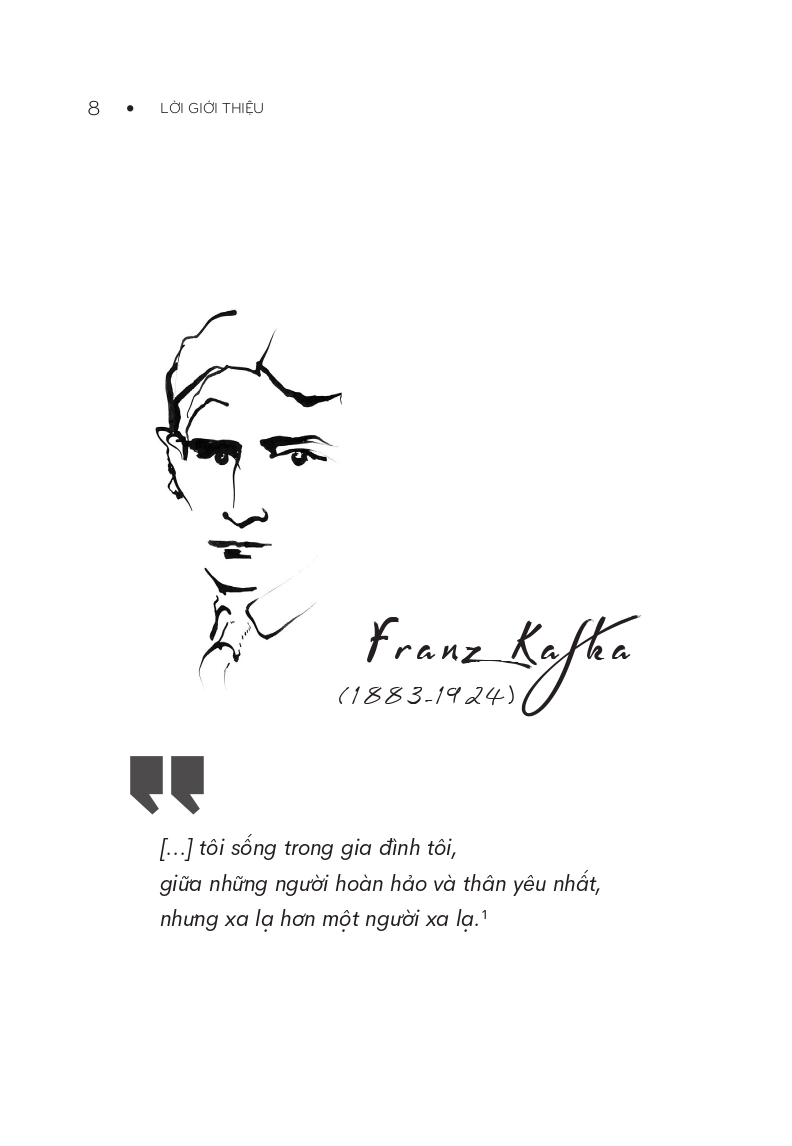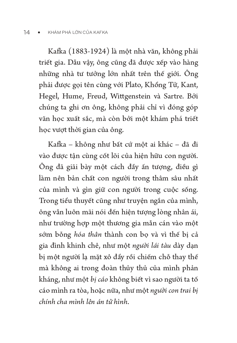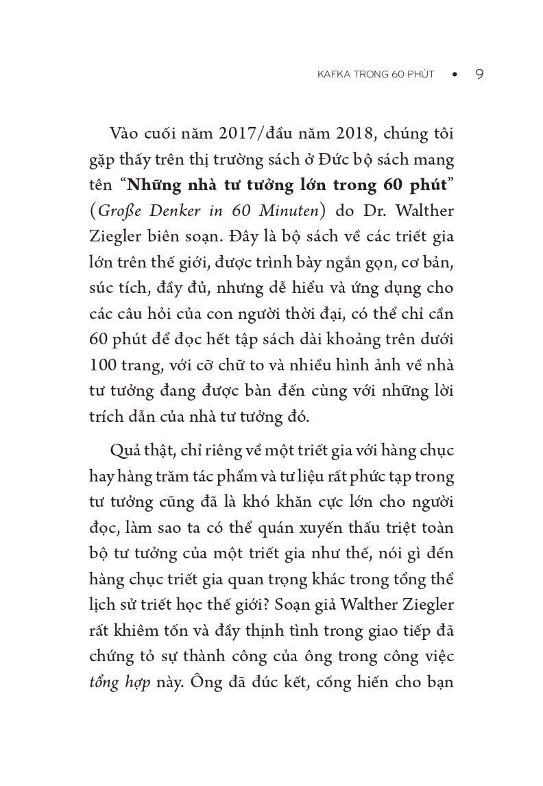 - Giới thiệu Những Nhà Tư Tưởng Lớn - Kafka In 60 Minuten - Kafka Trong 60 Phút Kafka là nhà văn tiếng Đức rất được yêu thích trên cả thế giới. Chúng ta ghi ơn ông không chỉ vì các tác phẩm của ông là một phần văn chương thế giới xuất sắc, mà còn bởi chúng là một khám phá triết học rộng lớn. Trong các truyện thuyết của mình, ông đã đưa đến cho ta một thức nhận sâu xa đi vào trong những vực thẳm, cùng với cái cấu trúc cơ bản về mối tương quan liên nhân. Không một ai có thể bàng quan trước những miêu tả và truyện thuyết của ông [...] một cuốn sách phải là cái rìu chặt chém tan vỡ cái biển nước đông cứng giá lạnh trong ta. “Triết học cho mọi người! Bộ sách Những nhà tư tưởng lớn lần đầu tiên trình bày sâu sắc công trình của các nhà triết học quan trọng nhất: Dễ hiểu, thú vị và rất thời sự.” - Martin Politowski “Kafka là một người đứng trước ngưỡng cửa hạnh phúc, nhưng suốt đời ông lại đã ở rất xa mảnh đất ước mong này. Cuốn sách viết về Kafka ở đây là một cuộc du hành khai phá. Với năm truyện thuyết của Kafka, ta có thể đi đến cốt lõi sự nghiệp triết học của ông và cuối cùng nhìn ra được chính mình ở trong đó.” – Ipek Demirtas