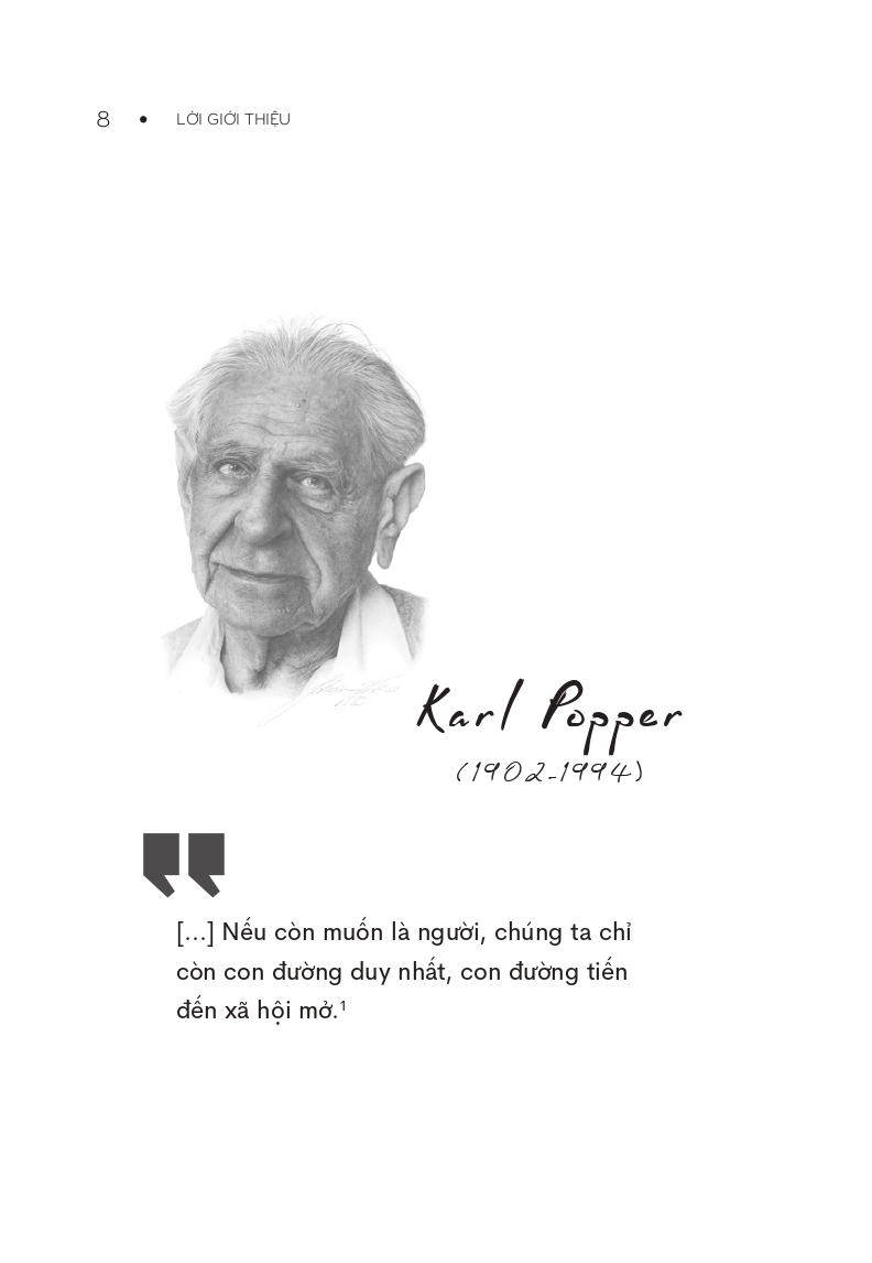 - Giới thiệu Những Nhà Tư Tưởng Lớn - Popper In 60 Minuten - Popper Trong 60 Phút Popper nêu ra lý tưởng về khoa học của “xã hội mở“: Mọi lý thuyết khoa học đều chỉ có giá trị hiệu lực cho đến khi nó bị phản bác bởi một ví dụ phản chứng hoặc bị thay thế bởi một lý thuyết chính xác hơn. Xã hội phải luôn luôn cởi mở đối với việc phê phán và đổi mới nhận thức của chúng ta Phương pháp thử và sai in dấu ấn lên sự tiến hóa. Từ muôn thuở, thực vật và động vật tối ưu hóa cơ may sống còn bằng những đột biến thất bại và thành công: Khoảng cách từ trùng a-míp đến Einstein chỉ là một bước. Triết học cho mọi người! Bộ sách Những nhà tư tưởng lớn lần đầu tiên trình bày sâu sắc công trình của các nhà triết học quan trọng nhất: Dễ hiểu, thú vị và rất thời sự.” – Martin Politowski “Tất cả đều được trình bày hết sức rành mạch: Phê phán của Popper đối với mọi chủ nghĩa toàn trị, yêu sách về xã hội mở, sự khích lệ những bước đi táo bạo trong khoa học và chính trị. Một gợi ý quan trọng trong thế giới đang tự mãn với chủ nghĩa tiêu thụ và lúng túng trong chính trị.”