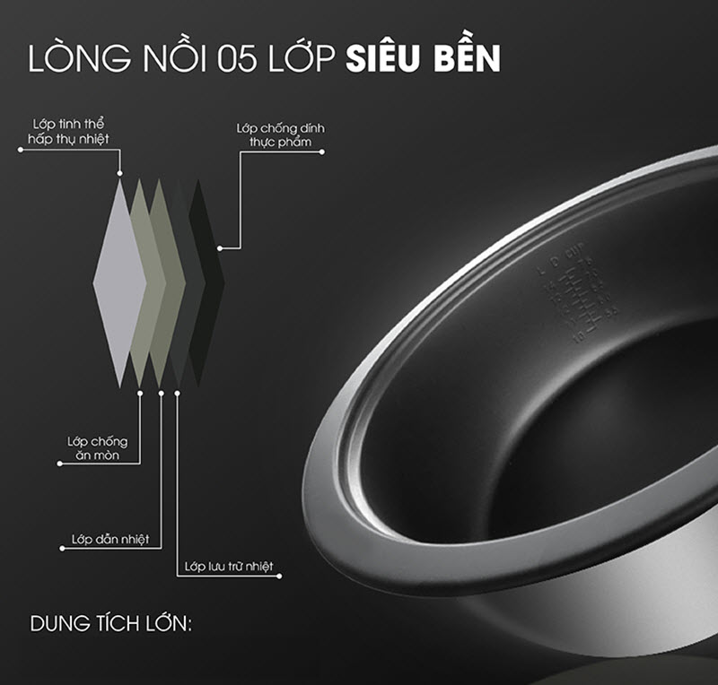 Đặc điểm nổi bật - Dung tích 5.4 lít nấu được khoảng 3.0 kg gạo. - Lòng nồi bằng hợp kim nhôm phủ chống dính cao cấp, an toàn cho sức khỏe. - Thiết kế nắp gài chắc chắn,