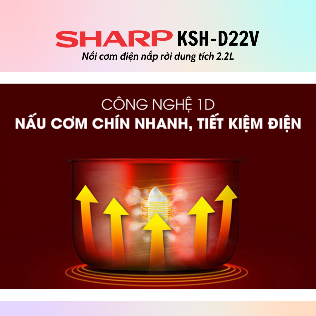- Nồi Cơm Điện Nắp Rời Sharp KSH-D22V có dung tích 2.2L thích hợp cho những gia đình từ vừa đến đông thành viên (khoảng 5 - 6 người). Bạn có thể chỉ cần 1 lần nấu cho cả gia đình nhờ dung tích lớn và công suất lên đến 800W giúp cơm chính đều hơn ngay cả những vùng có điện áp thấp.