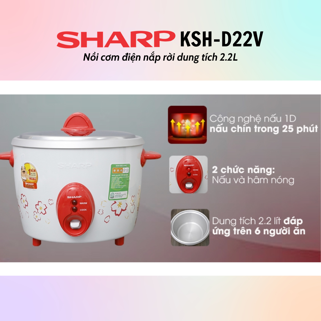 Nồi Cơm Điện Nắp Rời Sharp KSH-D22V - Màu Ngẫu Nhiên - Hàng chính hãng THÔNG SỐ KỸ THUẬT: - Thương hiệu: Sharp - Xuất xứ: Thái Lan - Tên sản phẩm: Nồi Cơm Điện Nắp Rời Sharp - Mã sản phẩm: KSH-D22V - Công suất: 800W - Dung tích: 2.2L - dành cho 6-8 người ăn - Lòng nồi: + Chất liệu lòng nồi: Nhôm không chống dính + Độ dày lòng nồi: 1.228 mm - Công nghệ và chức năng nấu + Công nghệ nấu: 1D (Toả nhiệt từ 1 hướng) + Chức năng: Giữ ấm, Nấu cơm - Điều khiển: Nút gạt - Phụ kiện đi kèm: Sách hướng dẫn, Cốc đong gạo, Muỗng nhựa - Dây điện nồi cơm điện: Tháo rời được - Chiều dài dây điện: 133 cm - Kích thước (RxSxC): 351 x 289 x 268 mm - Trọng lượng: 2,9kg - Bảo hành: 12 tháng MÔ TẢ SẢN PHẨM: - Nồi Cơm Điện Nắp Rời Sharp KSH-D22V có dung tích 2.2L thích hợp cho những gia đình từ vừa đến đông thành viên (khoảng 5 - 6 người). Bạn có thể chỉ cần 1 lần nấu cho cả gia đình nhờ dung tích lớn và công suất lên đến 800W giúp cơm chính đều hơn ngay cả những vùng có điện áp thấp. - Chất liệu bền bỉ: + Nồi cơm Sharp KSH-D22V có nắp làm bằng thép không gỉ sáng bóng, dễ vệ sinh. Tay cầm và chân đế làm bằng vật liệu Phenolic (loại nhựa cách nhiệt cao cấp) vừa không bị nóng mà còn cách điện rất tốt. + Lòng nồi với chất liệu nhôm cao cấp, phẳng và truyền nhiệt tối ưu. + Nắp nồi inox sáng bóng dễ vệ sinh, thiết kế có lỗ thoát khí chống trào. - Khả năng giữ ấm đến 5 giờ: Trong vòng 5 giờ sau khi nấu thì cơm vẫn còn giữ được độ ấm phù hợp để bạn có thể dùng mà không cầm phải hâm lại, tiết kiệm thời gian cũng như điện năng. - Đa dạng chức năng nấu: + Công nghệ nấu 1D, công suất 800W nấu cơm nhanh chín, tiết kiệm điện. + Sử dụng đơn giản bằng nút gạt với 2 chế độ “cook” và “warm”.