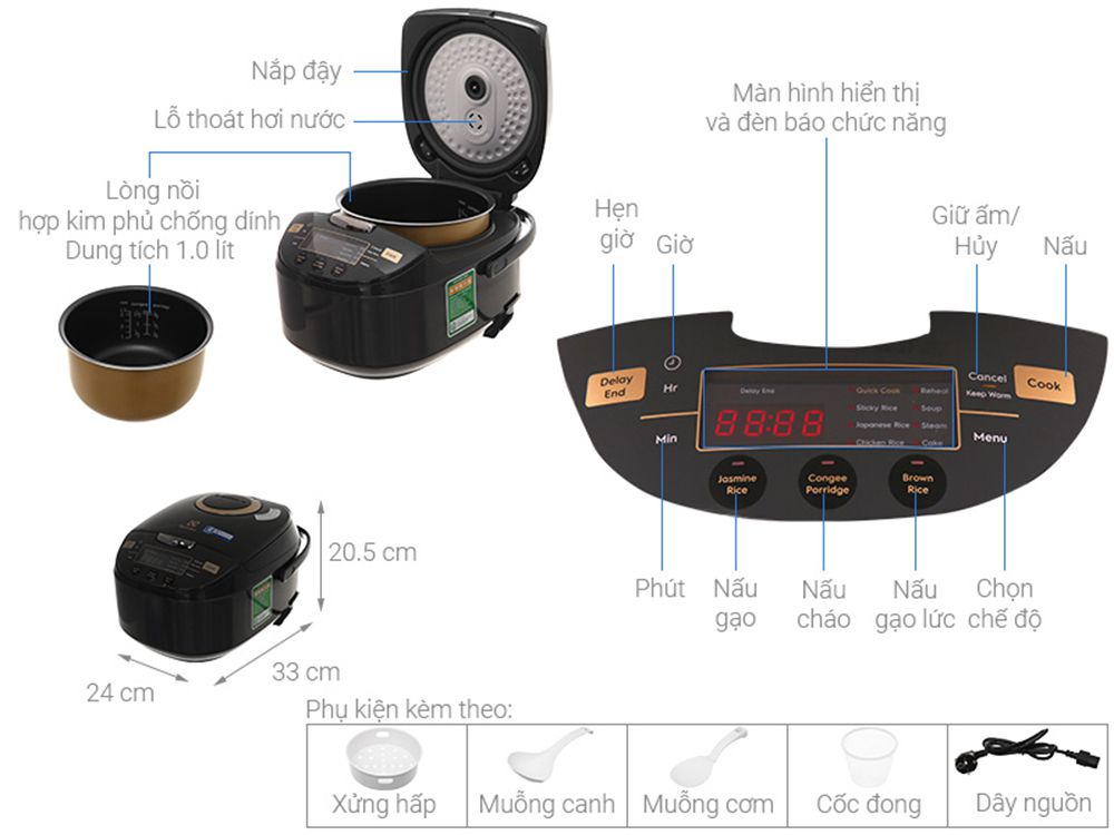 - Phụ kiện kèm theo: Xửng hấp, muỗng múc canh, muỗng múc cơm Tính năng
