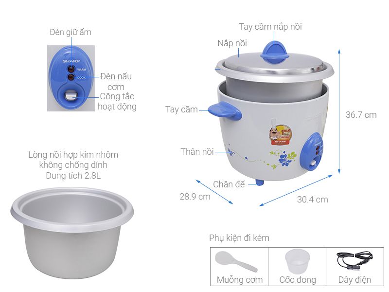 '- Dung tích: 2,8 L, DÒNG SP CAO CẤP - Kiểu nồi thân cong sharp vỏ tôn 1 lớp dày - Công suất/Điện áp: 900W - Giữ nóng bằng bảo ôn áp đáy, công suất