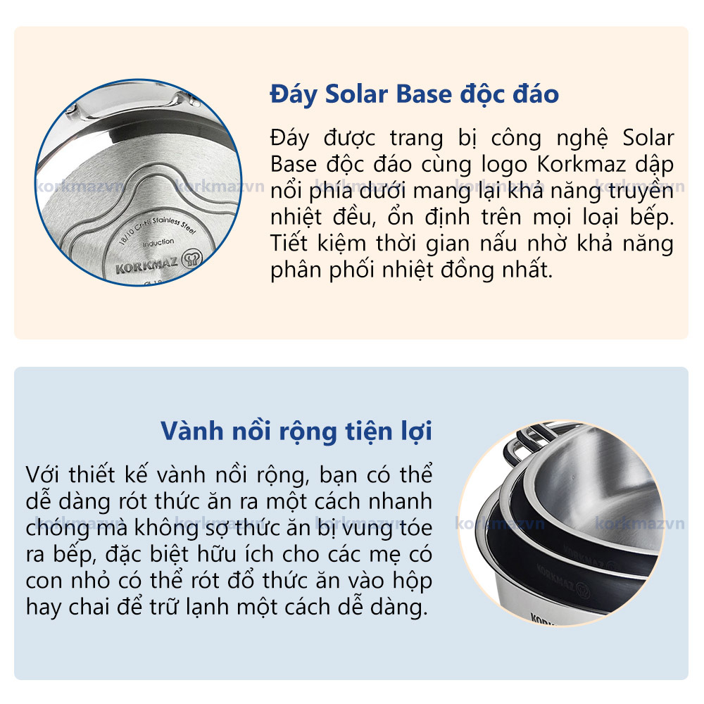 - Thương hiệu Châu Âu Korkmaz được dập nổi dưới đáy nồi