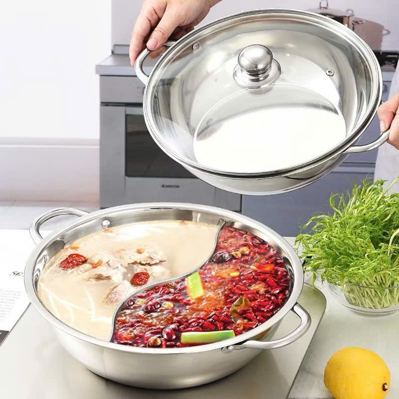 Nồi Lẩu Inox 2 Ngăn 30cm Nấu Được Bếp Từ và Bếp Gas, Có Nắp Kính Chất Lượng Cao