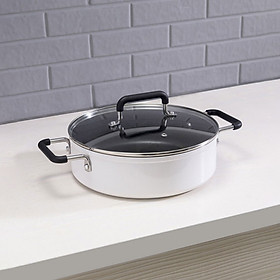 Thông số kỹ thuật Màu sắc: Vàng đồng ánh kim; Đen giả đá Kích thước (Đường kính x Chiều cao x Độ dày): 26 x 8 x 0,24cm Chất liệu: Nhôm cao cấp Quai nồi: