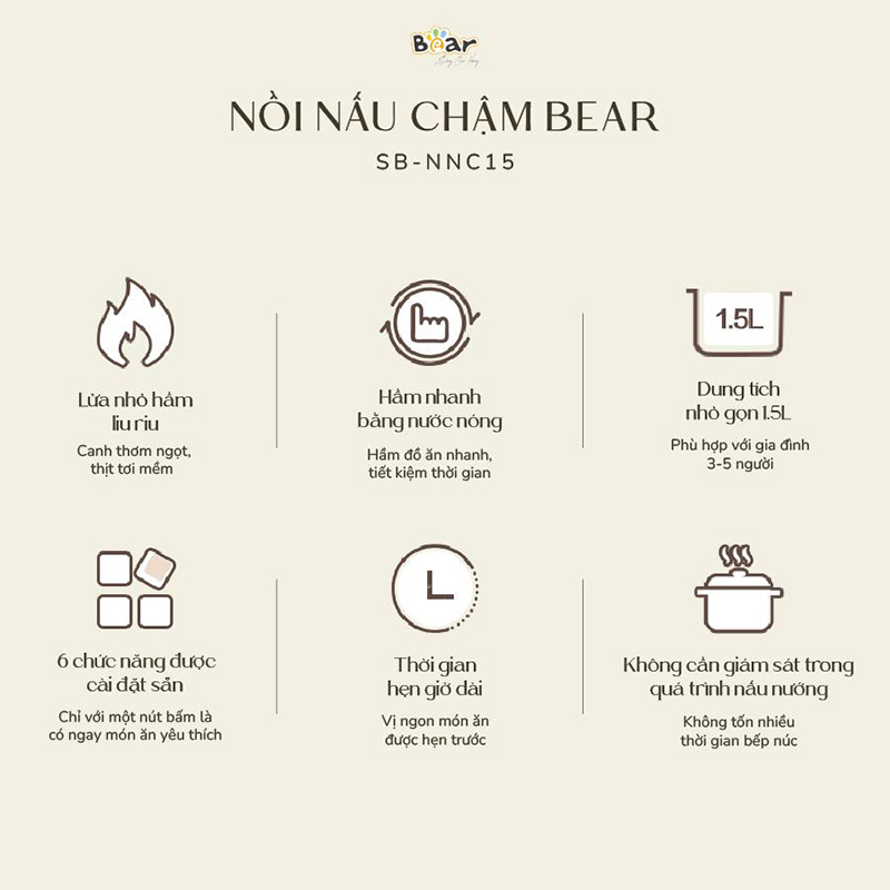 Nồi nấu chậm 1.5L Bear sở hữu nhiều tính năng và công dụng vượt trội, đã nhanh chóng nhận được sự săn đón nhiệt tình từ cộng đồng người tiêu dùng Việt. Bên cạnh đó, thiết kế