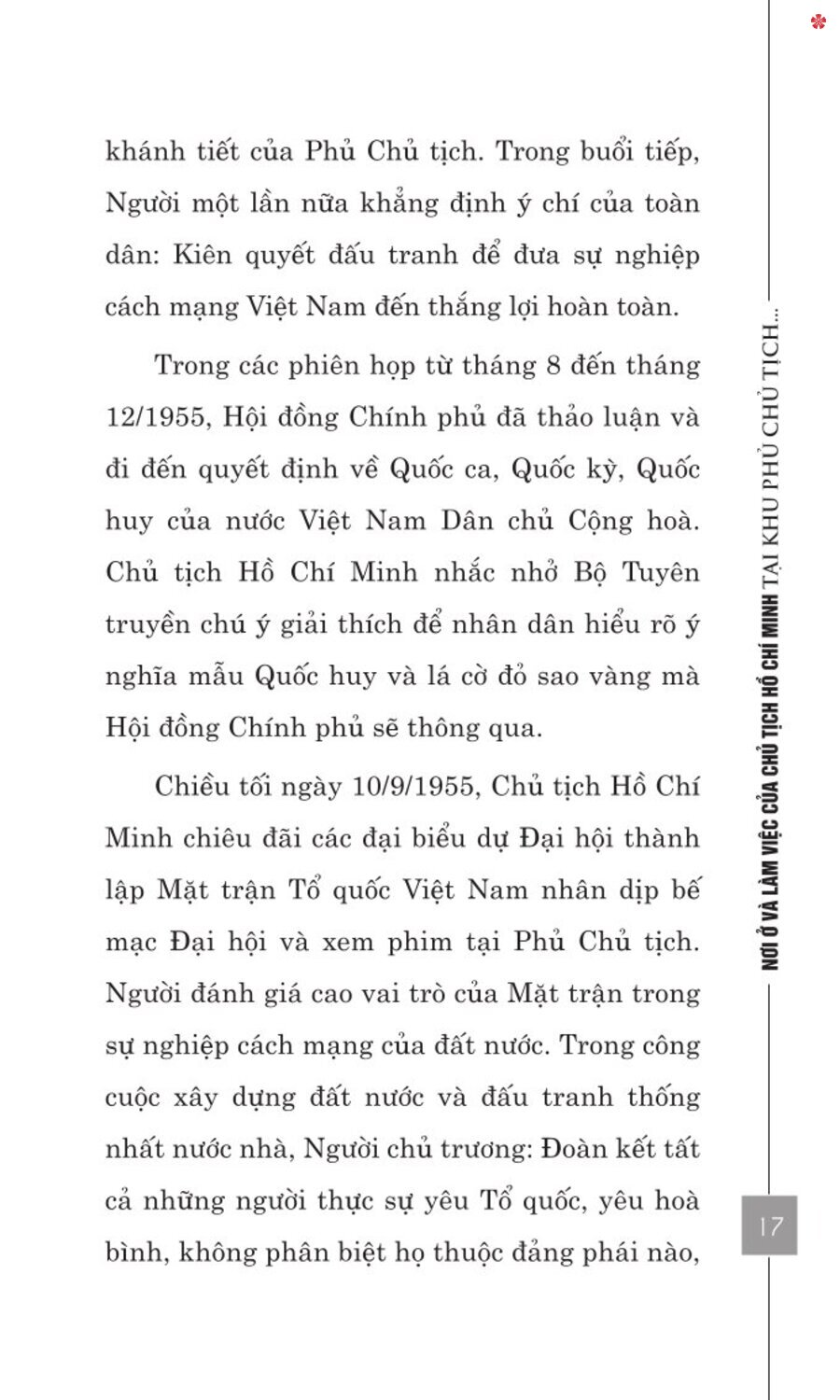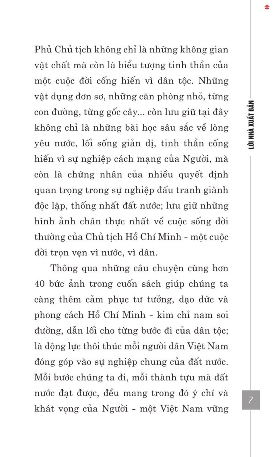 Cuốn sách tái hiện một cách chân thực, đưa độc giả đến với từng góc nhỏ, từng kỷ vật, từng câu chuyện giản dị nhưng thấm đẫm ý nghĩa lịch sử và nhân văn về những địa điểm gắn bó với Chủ tịch Hồ Chí Minh tại Khu Phủ Chủ tịch như: Nhà 54, Nhà sàn, Nhà 67, ao cá, vườn xoài, hàng cây...