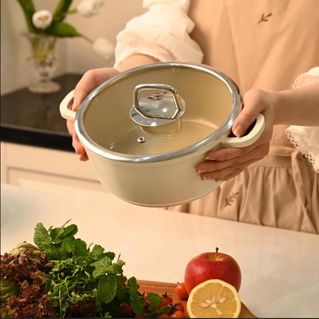 Nồi chống dính phủ gốm Hàn Quốc dung tích 2.2L size 20cm Tên sản phẩm: Nồi chống dính phủ gốm  Model: N20 Kích thước: Ø20 x cao 8.9cm (đường kính miệng 20cm, cao 8.9cm, dài cả quai 26cm,