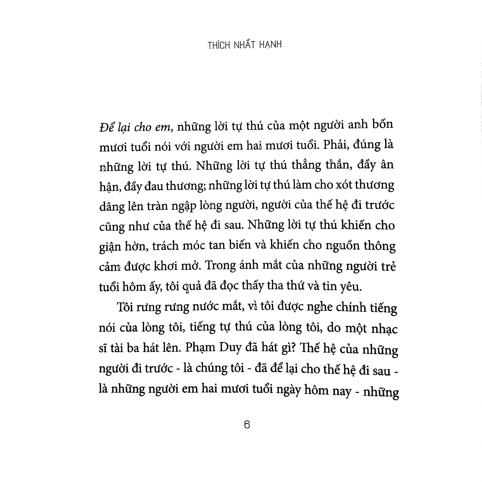 Những lời chia sẻ của Thiền Sư thấm sâu vào lòng những người trẻ tuổi, khơi gợi những ước mơ hoài bão, khơi dậy sức sống dạt dào trong trái tim của họ, làm bừng cháy những yêu thương. Nói với tuổi hai mươi tìm thấy điểm đồng điệu trong lời thơ của Tố Hữu: "20 tuổi hồn quay trong gió bão/ gân đang xanh và thớ thịt căng da", và sức trẻ đó phải được tỏa sáng trong tình yêu và trách nhiệm với đất nước, trong lý tưởng và khát vọng, trong tình yêu và cuộc sống của mình.