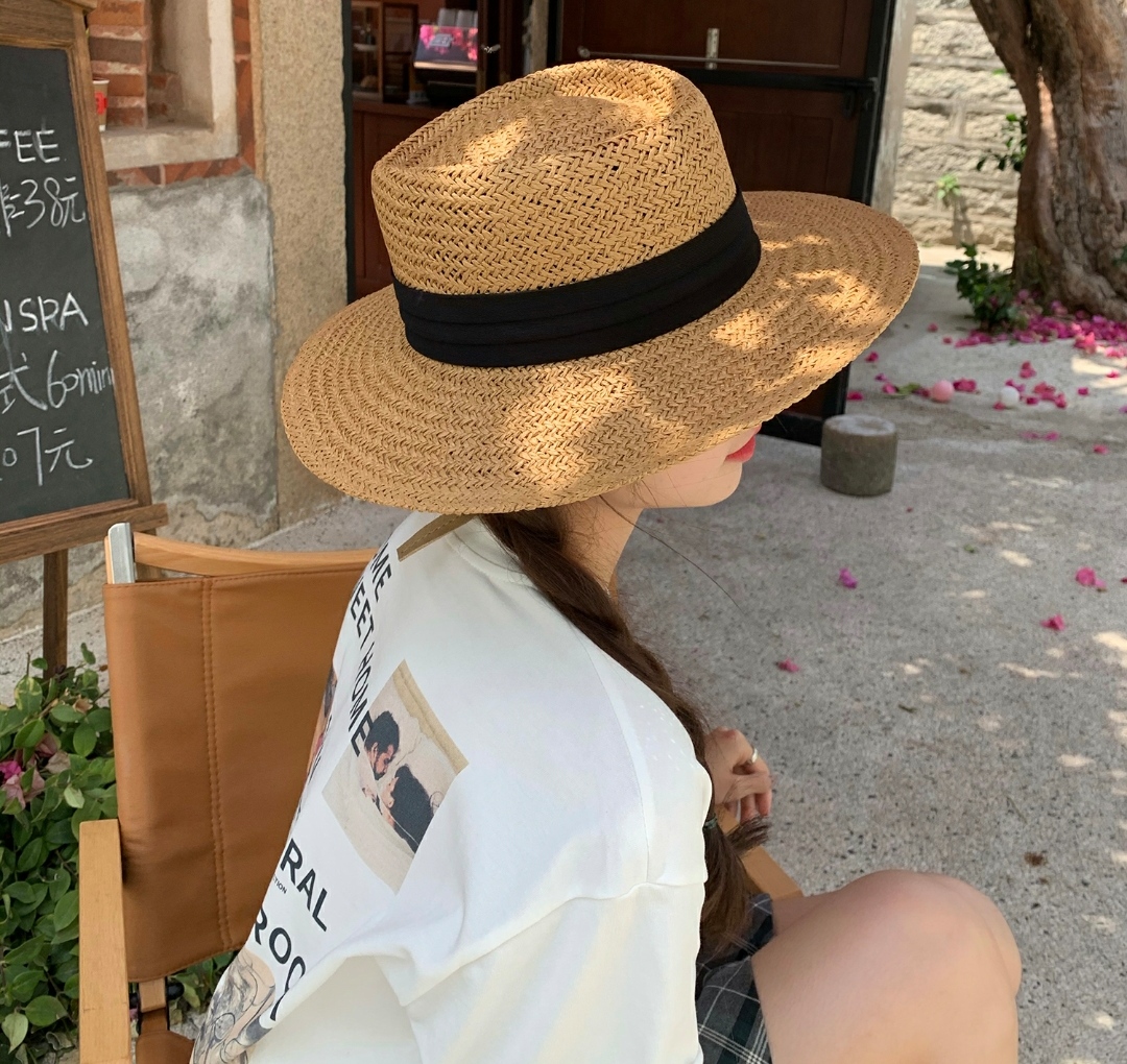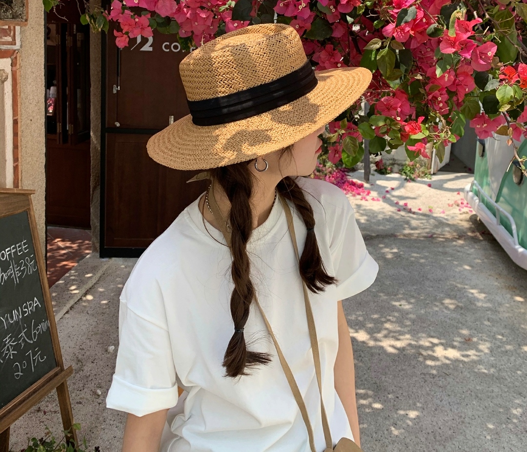 Mũ cói rơm vành phẳng nữ mùa hè phiên bản Hàn Quốc chống nắng UV cho kỳ nghỉ Nón đi biển Paris thời trang hàng đầu Pháp Chất liệu cói