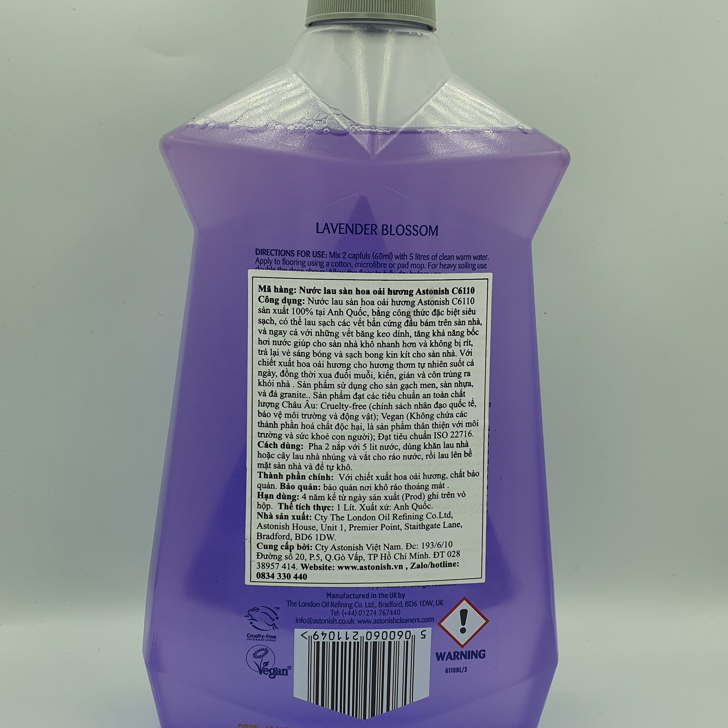 Nước lau sàn hoa oải hương Astonish C6110 sản xuất 100% tại Anh Quốc, bằng công thức đặc biệt siêu sạch, có thể lau sạch các vết bẩn cứng đầu bám trên sàn nhà và ngay cả với những vết băng keo dính, tăng khả năng bốc hơi nước giúp cho sàn nhà khô nhanh hơn và không bị rít, trả lại vẻ sáng bóng và sạch bong kin kít cho sàn nhà. Với chiết xuất hoa oải hương cho hương thơm tự nhiên suốt cả ngày, đồng thời xua đuổi muỗi, gián và côn trùng ra khỏi nhà .