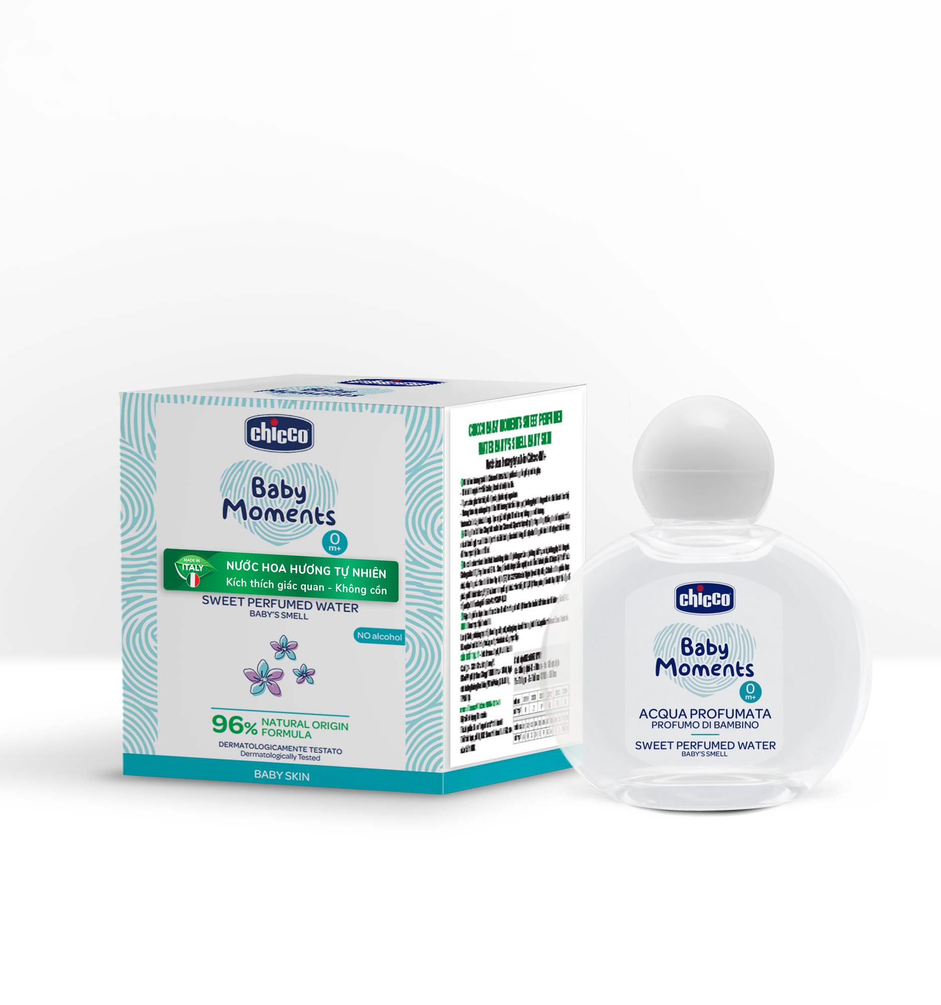 An toàn cho trẻ sơ sinh: Nước hoa không chứa cồn, không parabens, không chất tạo màu, không gây kích ứng da. Không chứa BHT, Tropolone và EDTA. Sản phẩm đã được kiểm nghiệm da liễu và thành phần đã được Bộ Y tế Ý xác nhận đáp ứng các tiêu chuẩn theo Quy định (EC) N.1223/2009 của Nghị viện và Hội đồng Châu Âu. Sản phẩm được phân phối chính thức tại Ý, EU và hơn 100 quốc gia khác trên thế giới. Tại Việt Nam, sản phẩm đã được Bộ Y tế cấp số tiếp nhận Phiếu công bố 155614/21/CBMP-QLD.