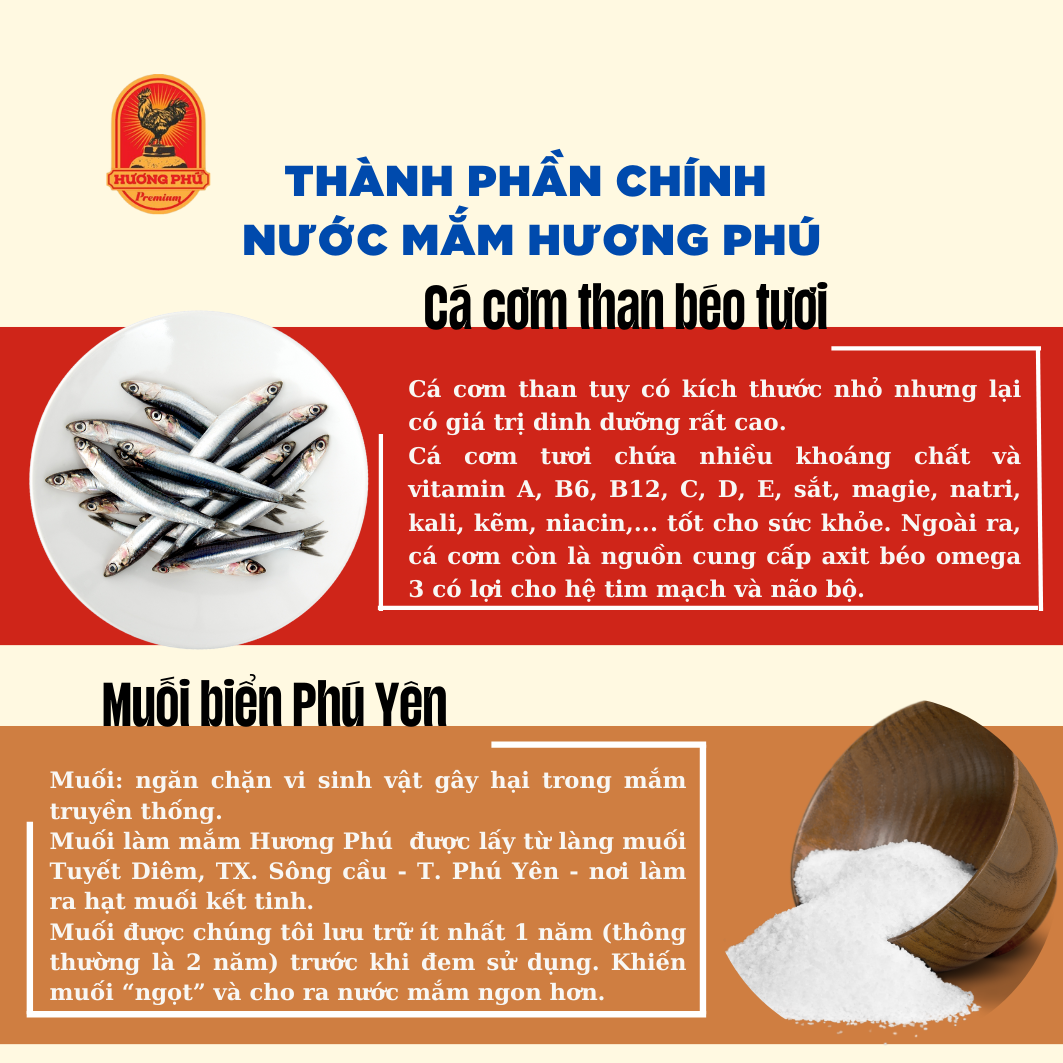 Với 100% cá cơm tươi, béo ú được chọn lựa kỹ được kết hợp với muối tinh khuyết được ủ bằng phương pháp truyền thống trong thùng gỗ được lên men tự nhiên, sau 18 đến 24 tháng những dòng nước cốt nguyên chất, không pha được rút, nhỉ ra từng giọt mắm màu cánh gián đẹp mắt, đậm đà hậu vị ngọt dịu, được đóng chai tạo nên Nước mắm cá cơm HƯƠNG PHÚ 40 độ đạm.