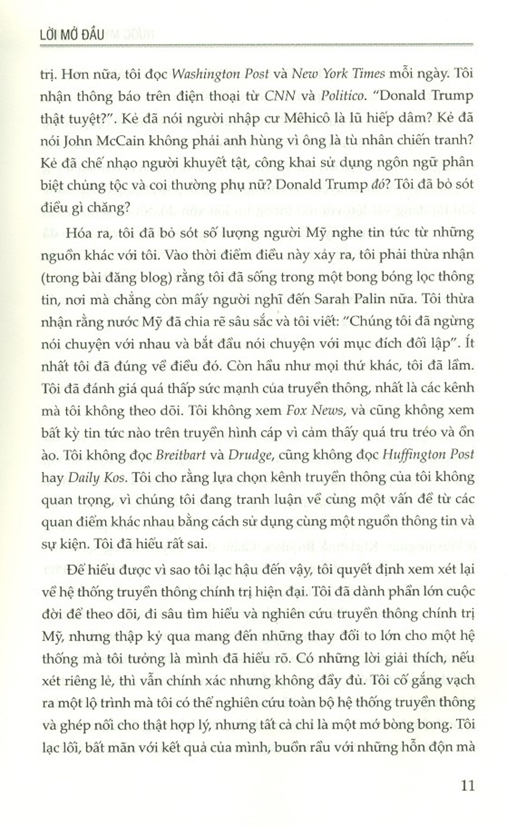 Cuốn sách nỗ lực giải thích cơn bão tiền bạc, công nghệ và tinh thần đảng phái đã tạo ra hai thái cực thông tin hoàn toàn tách biệt: một vòng tròn nhỏ, khép kín cho cánh hữu và một khu vực rộng mở, ngổn ngang cho những người còn lại. Điều này hình thành hai thực tế, hai câu chuyện và hai phe phái chính trị bất đồng quan điểm với cơn giận dữ khủng khiếp thường trực khắp nơi. Để nắm bắt đầy đủ các khía cạnh sâu xa của thế giới truyền thông, tác giả đã tiến hành nhiều cuộc phỏng vấn chuyên sâu với các nhân vật truyền thông và chính trị gia hàng đầu nước Mỹ, phân tích từng bước phát triển của cỗ máy truyền thông, đưa ra những gợi ý về cách khôi phục đối thoại quốc gia, trong khi vẫn bảo vệ quyền thể hiện thái độ bất đồng một cách phù hợp.