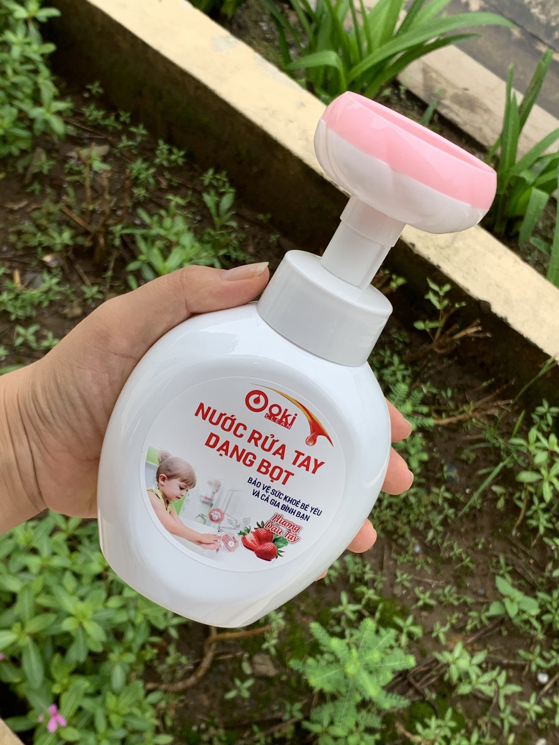 - KHÔNG phẩm màu Công Dụng: Có khả năng diệt được 99,99% vi khuẩn có hại và đồng thời kéo trôi đi các chất dơ bẩn trên tay. Bọt tuyết sử dụng tiết kiệm hơn tới 3 lần so với các sản phẩm thông thường khác nhờ thiết kế đặc biệt của bơm tạo bọt. Không chứa xà phòng, không chứa xút, độ PH cân bằng giúp bảo vệ làn da nhạy cảm nhất của bé. Mùi hương tự nhiên dịu nhẹ rất dễ chịu Đặc biệt có tính khử độc tốt, ngay cả khi vừa dùng xong vẫn có thể cầm nắm thức ăn, đồ dùng mà không gây độc. Tác dụng làm sạch và khử trùng da tay. An toàn cả với những làn da nhạy cảm nhất là khi dùng cho trẻ em. Cách Dùng : Nước rửa tay dạng bọt OKI Bước 1: Tháo khoá vòng trên cổ chai Bước 2: Đặt lòng bàn tay phẳng trên nắp. Nhấn 1 lần nhẹ nhàng từ trên xuống. Lưu ý: Giữ tay khô trước khi nhấn nắp Bước 3: Xoa đều tay cho tan hết bọt hoa Bước 4: Rửa sạch với nước. Quy cách đóng gói: chai Thể tích: 500g Hương Dâu Tây. Hạn sử dụng: 3 năm kể từ ngày sản xuất Chỉ cần lấy 1 lượng nước thích hợp ra tay và chà sát nhẹ nhàng Dùng cho cả gia đình, trẻ em dùng dưới sự giám sát của người lớn. Xuất xứ: Việt Nam Giá: 99k̵ --->75k / chai hình bông hoa, hình chân gấu 500g. (màu nắp ngẫu nhiên) Lưu ý: